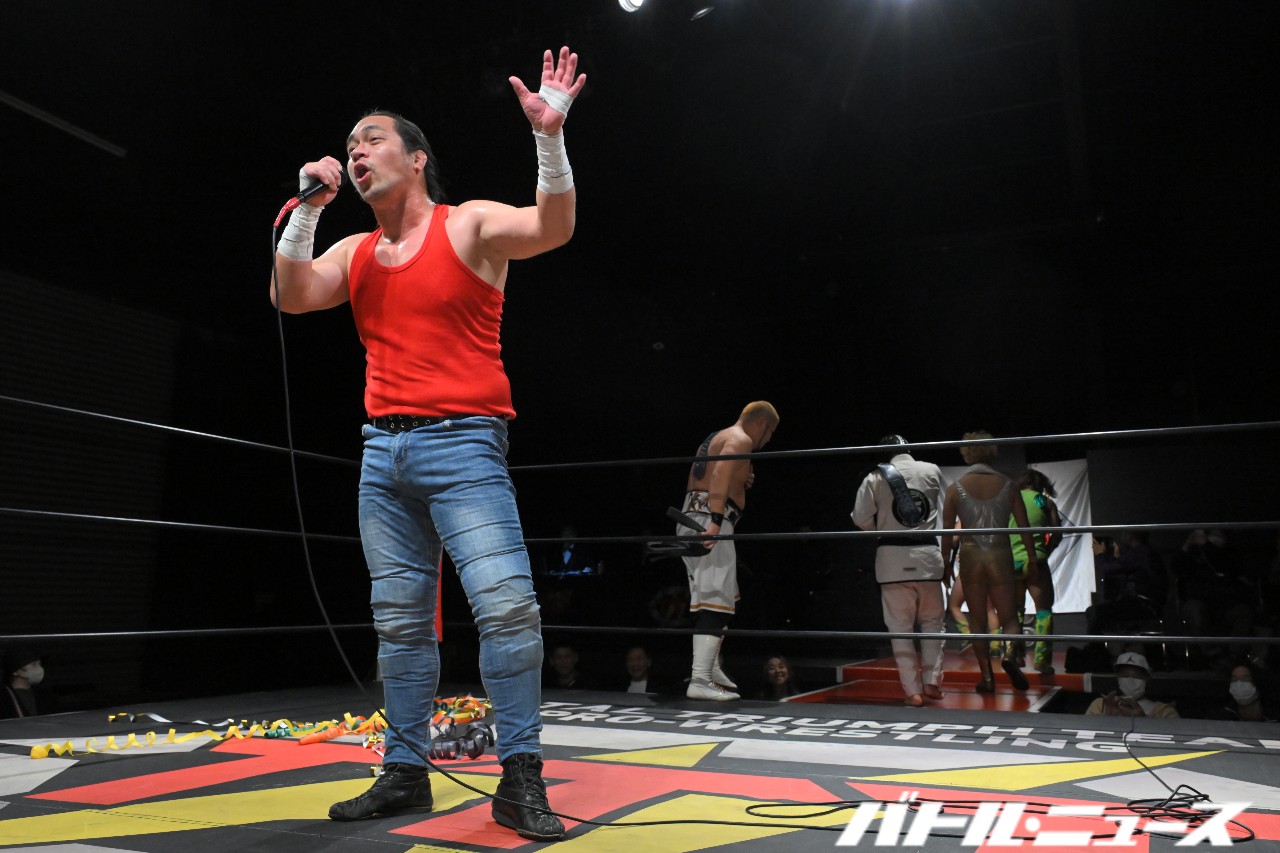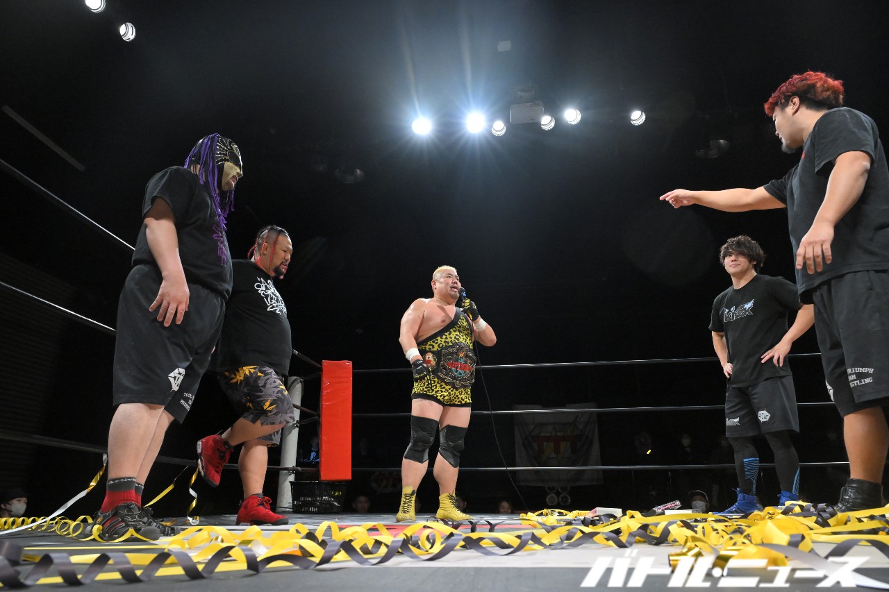 ガッツ「勝ったぞ~!FACEでベルト獲って、すぐに11月3日に獲られたけど、相手のルール、完全決着で取り返したぞ~!そして1つ、お礼を言いたい男がいる。定アキラ、リングに上ってきてくれ!(※定がリングへ)今日は助けてくれてありがとう。お前も、行き場がないんだろう?なあ?なあ?俺んとこ来ていいんだぞ?ミっさん(※ミステリー)、正規軍の新しいメンバーです。正規軍もさ、今瀧澤がしれっと抜けて人数少ないし、KURO-OBIさんは黒帯軍団っつってなんか好きなことやってるから。本隊は我々5人しかいない。……あ゛?なんだお前、なんか言いたいことあんのか?」