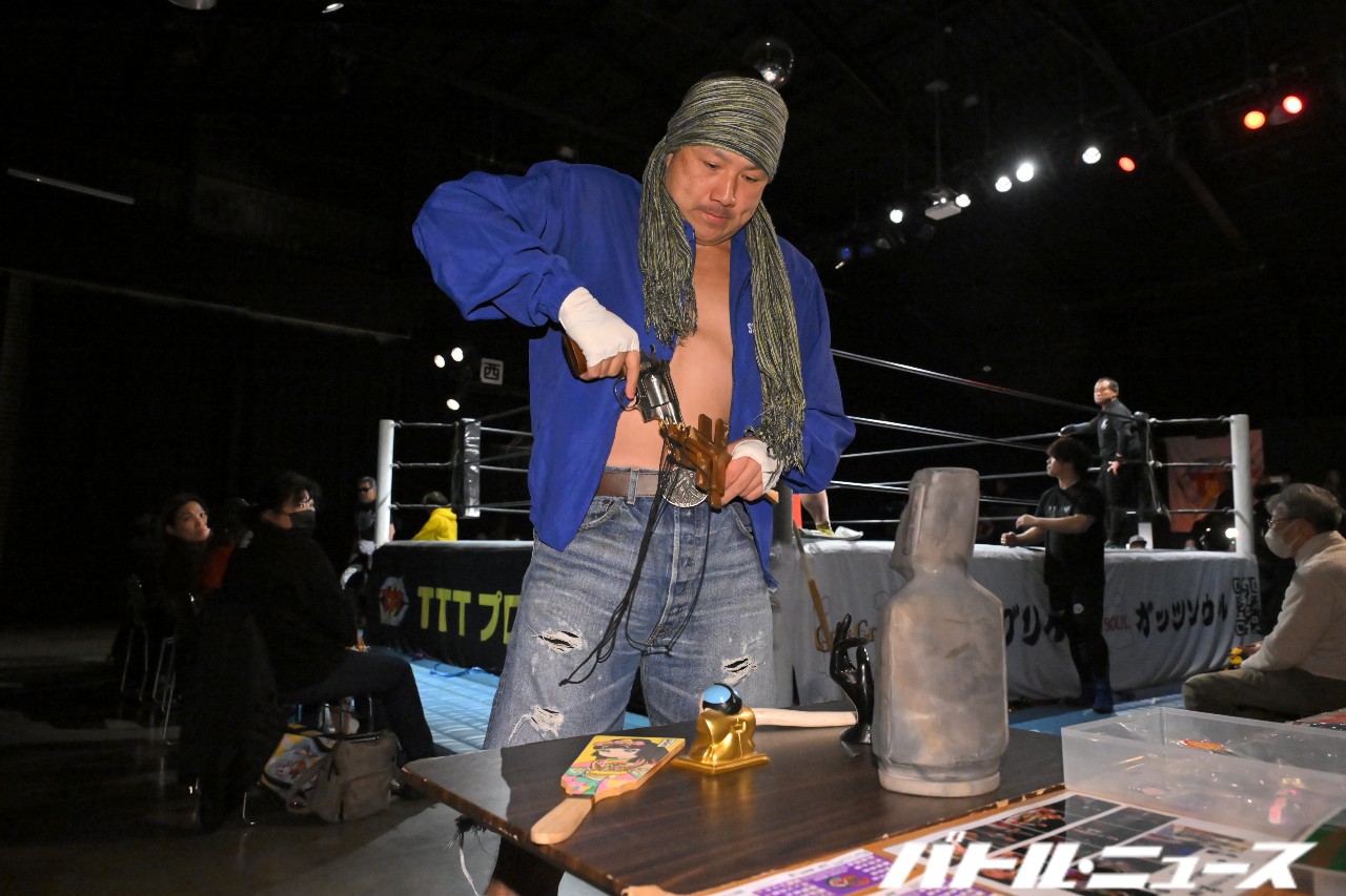ガッツは竹刀&イス、そしてメリケンサックグローブと思しきものを両手に装着して登場。秀旺は大量のVHS、モアイ像、福助人形、手のオブジェ、サーベル、十字架、なんらかの動物のツノ、鳩サブレーの缶蓋、羽子板、拳銃を持ち込む。