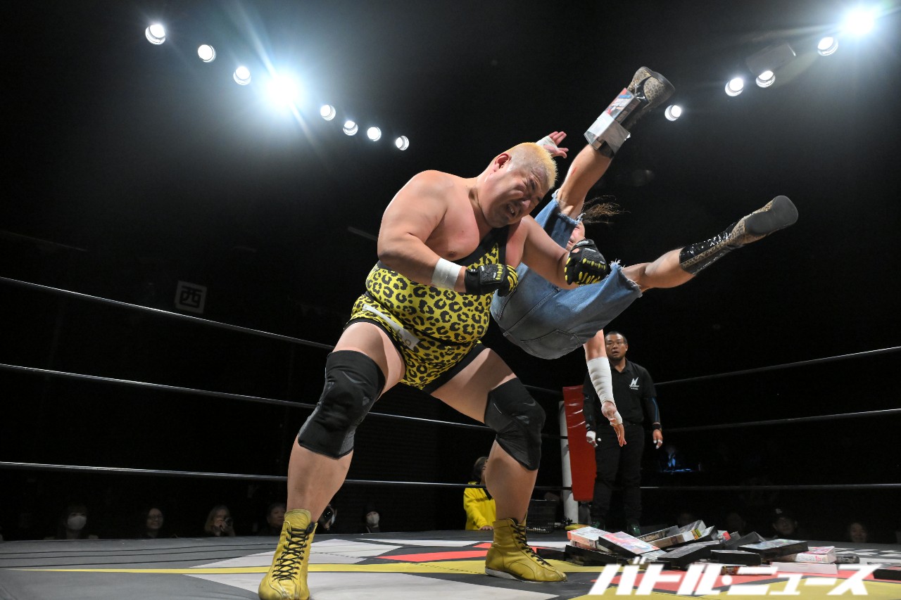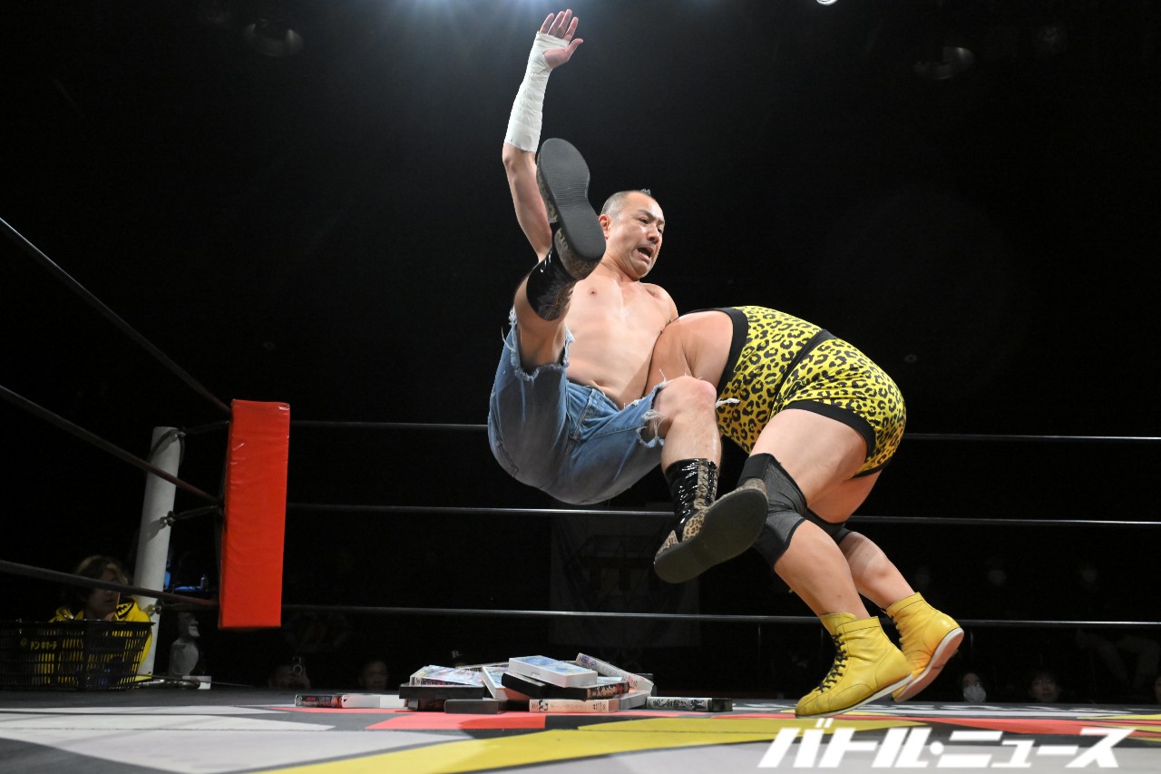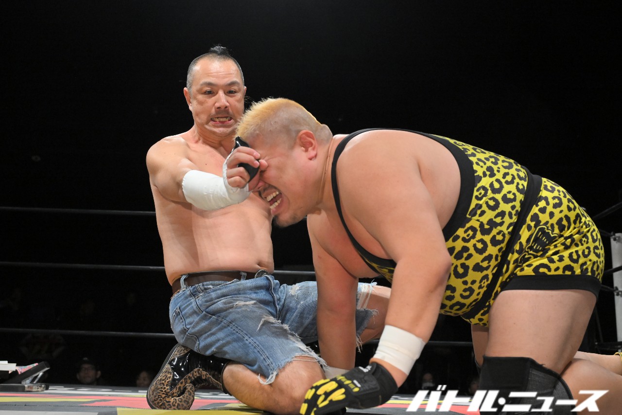 ガッツはガバリと起き上がってボディスラム。「立てコラ!」と鬼神咆哮から鬼神ナックルを連打も、秀旺はローブロー。