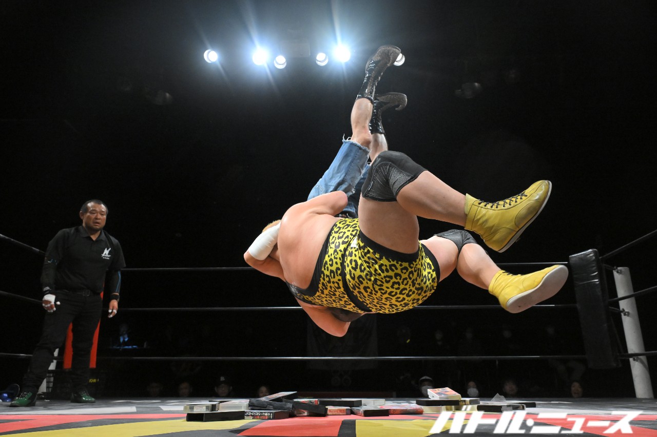 2人は熾烈なチョップ合戦からラリアット合戦を展開。秀旺はサミングからラリアットを狙うが、かわしたガッツが延髄切りからラリアット。さらにVHSの山の上にゴーストバスターで突き刺すもカウントは2。