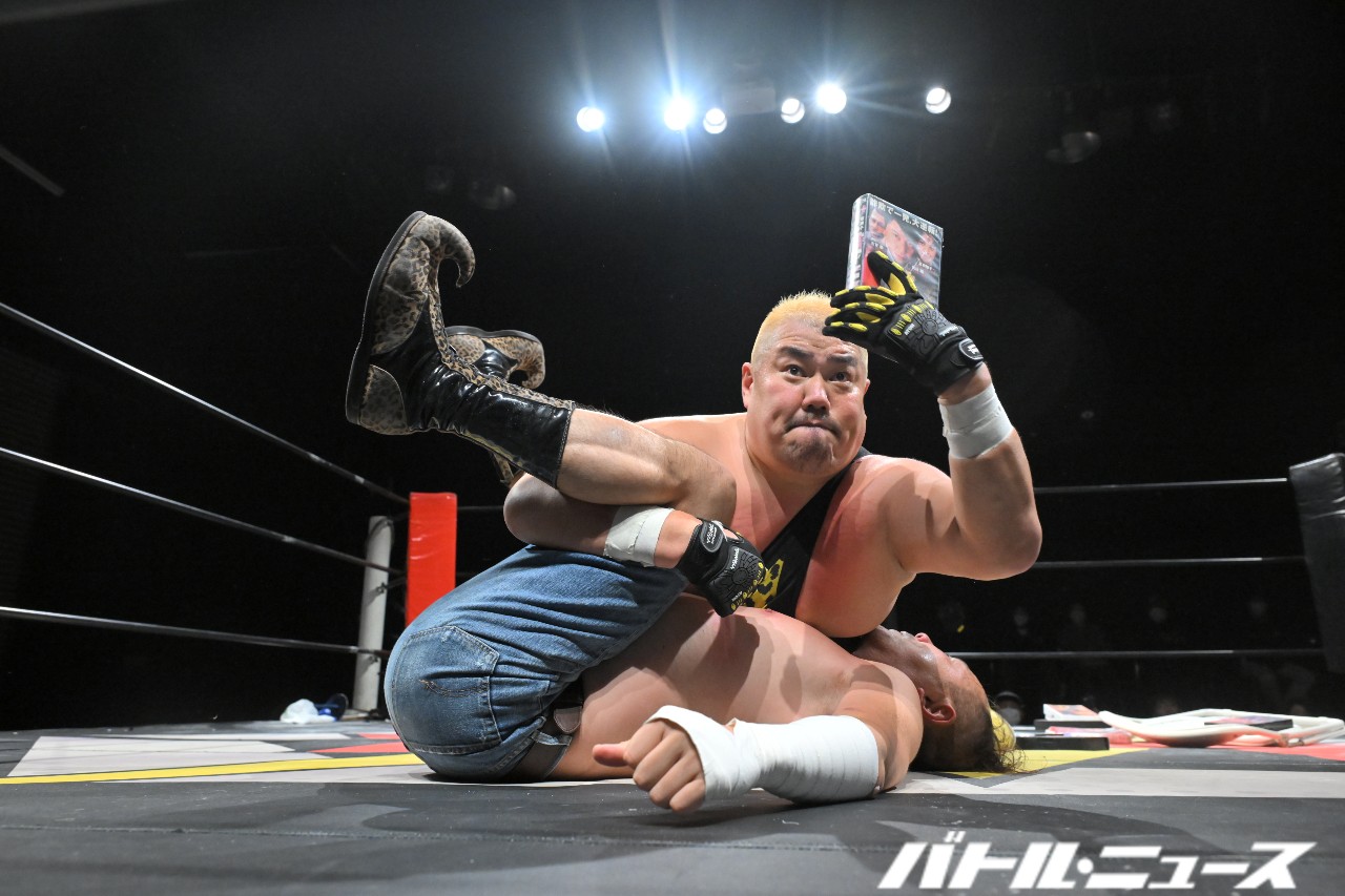定はゴキブリ商会の3人を蹴散らし、秀旺へトラースキックからVHSで頭をぶん殴る。その後は瀧澤を拉致して去っていき、藤田もそれを追いかけていったためリング上は純粋な1vs1に。
