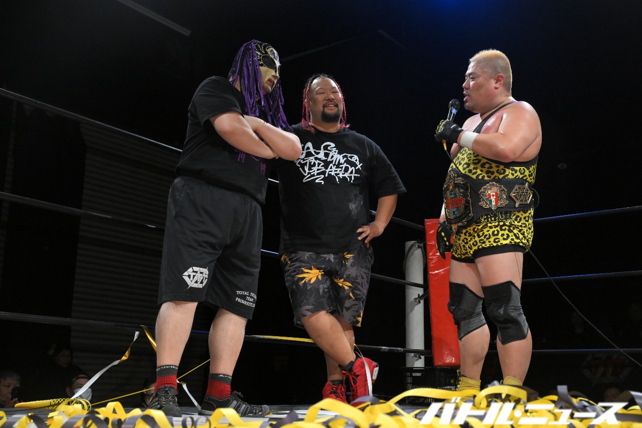 試合後には千賀が「絶対に俺たちみたいなイロモノが勝つと思ってなかった」と驚きながらも「もう最高のパートナーを見つけたんで、ツトム・オースギはもういらないです。大家健もいらないです。BASARAでトランザム☆ヒロシと組んでるんだけど、アレも多分いらないから。この3vs3でタイトルマッチ、やってやるぜ!」と、かつての仲間たちを切り捨てて新た仲間とやっていくことを宣言していた。
