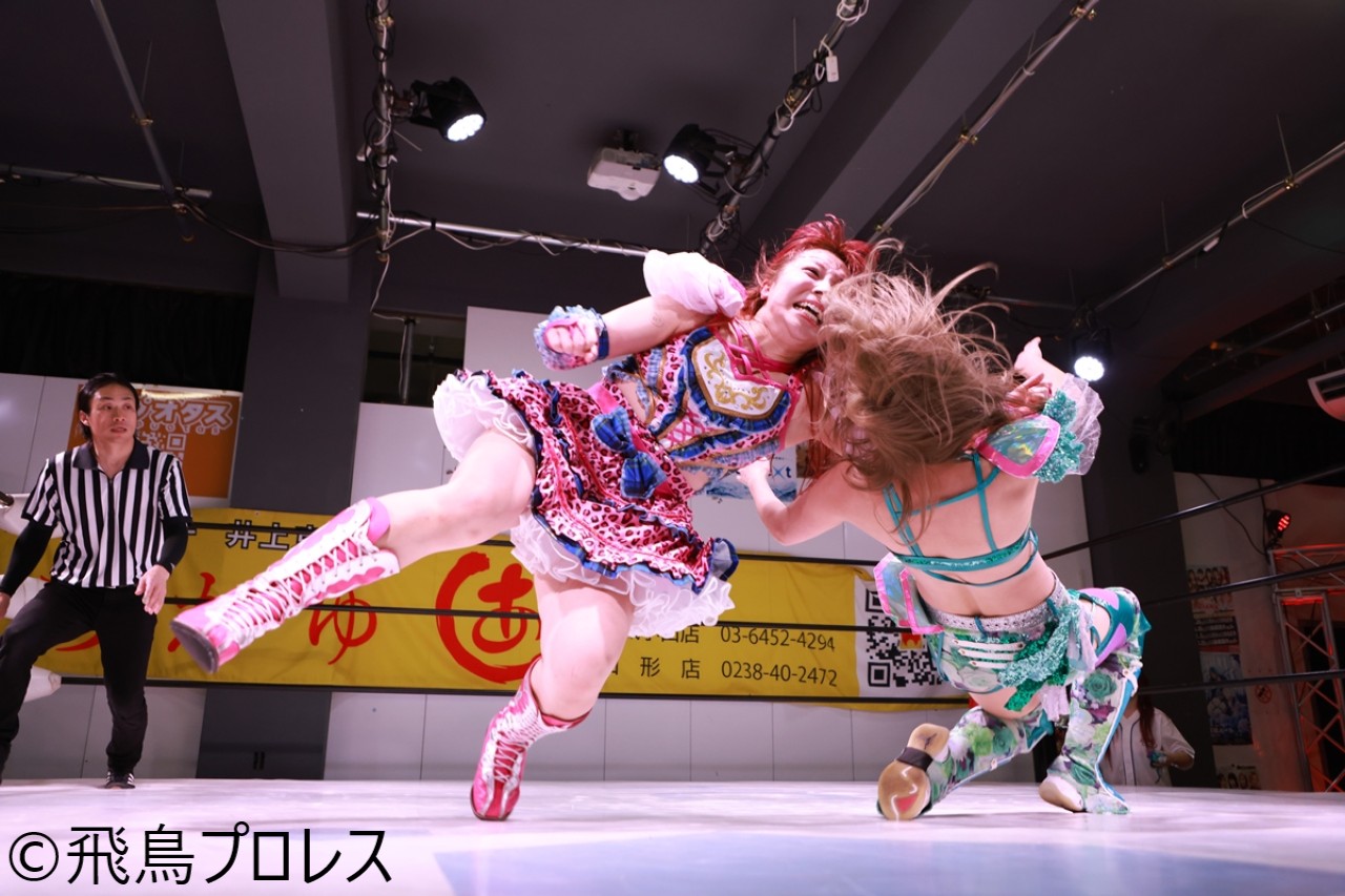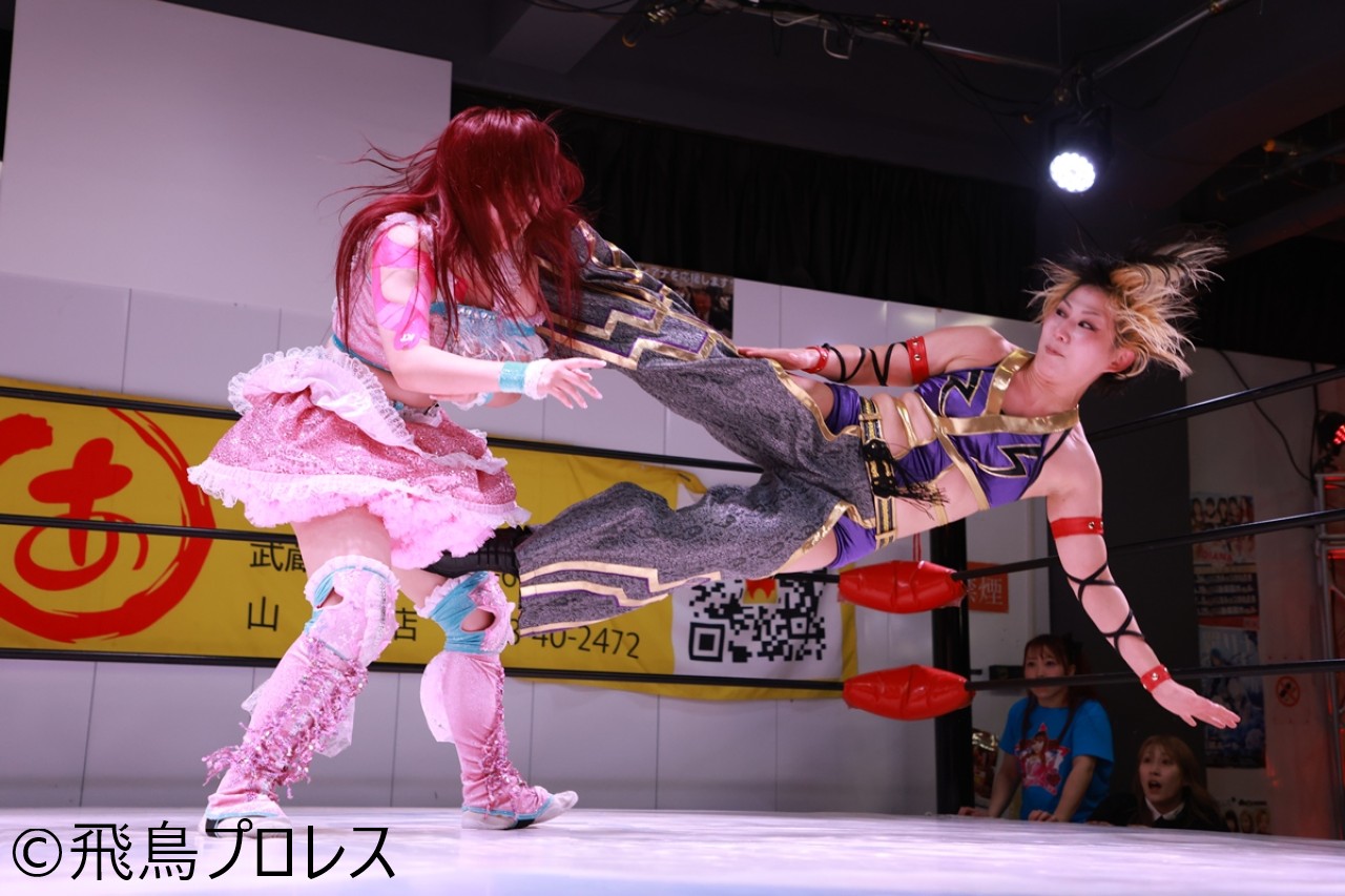 飛鳥プロレスが11月23日、神奈川・ポスト・ディ・アミスタッド(川崎市)で年内最終大会を開催した。 “新生・飛鳥のエース” しのせ愛梨紗が師・紫雷美央とのシングルでの決着戦を制した。愛梨紗は2026年1月7日、インイタ(TOKYO SQUARE in Itabashi)で、同年1・12後楽園で引退する“憧れの人”世羅りさと最後の一騎打ちに挑むことが決定した。