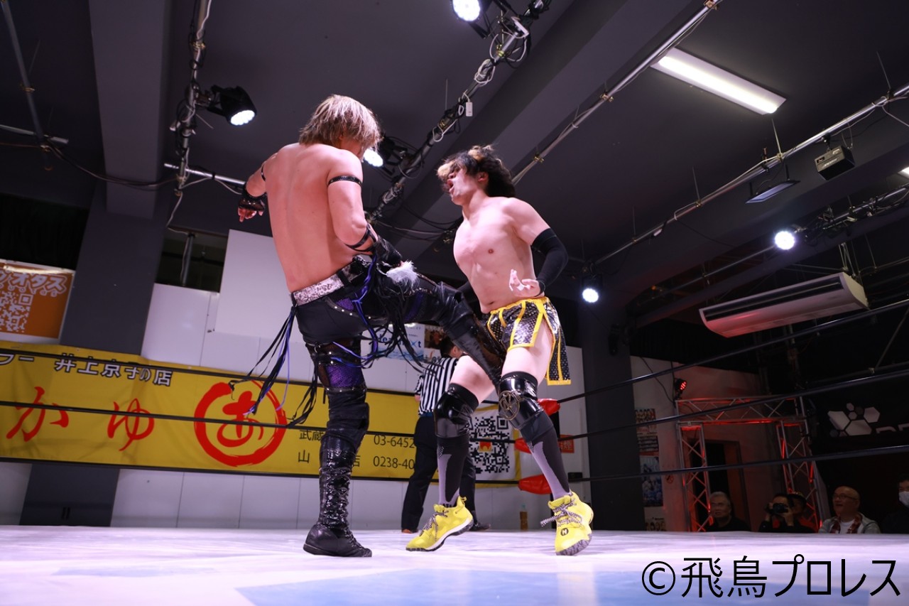 真琴&瀧澤の飛鳥レギュラー組が、治安の悪い政岡&エチカと異色対決。開始早々、場外戦となり、政岡組のペースに。政岡が瀧澤にイス攻撃、脱いだTシャツで首を絞める。瀧澤はドロップキックで2人まとめてぶっ飛ばした。セコンドの松澤さんが介入し、真琴が政岡にカカト落とし。政岡が真琴にツバを吐く暴挙。真琴がエチカにDDT、ビッグブーツ、ダブルニーもカウント2。瀧澤と政岡がエルボーのラリー。真琴組が政岡にダブルでビッグブーツ。真琴が政岡にエッジ直々伝スピア、瀧澤がジャックナイフで丸め込むも2カウント。レフェリーのブラインドを突いて、政岡が瀧澤に急所蹴り。すかさず政岡が首固めで3カウント。