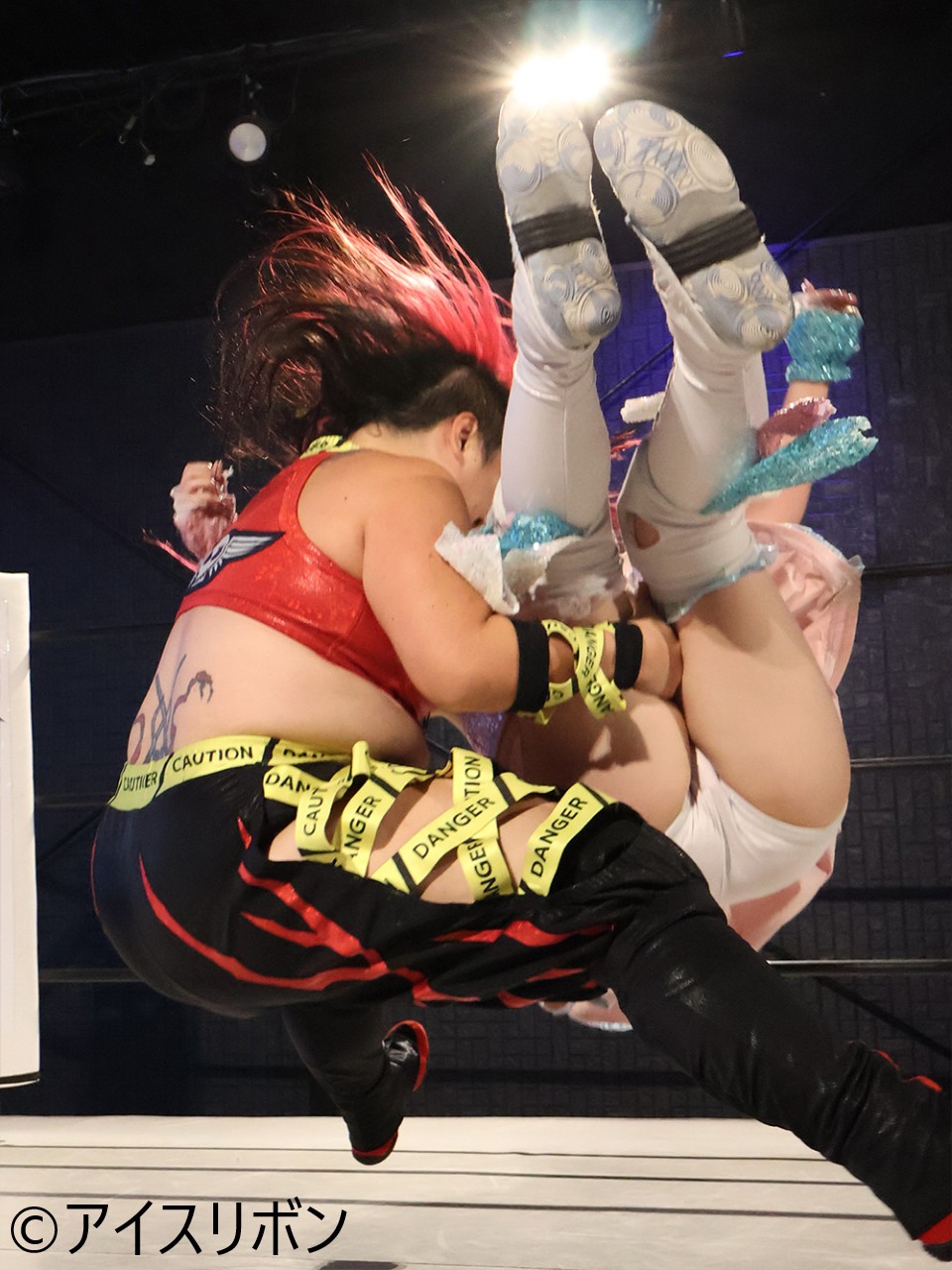 もえがボディプレスも杏ちゃむが剣山。コーナーに上がった杏ちゃむをもえが投げ飛ばし、今度はもえがコーナーに上がっての旋回式ダイビングボディプレス。カバーもカウント2。