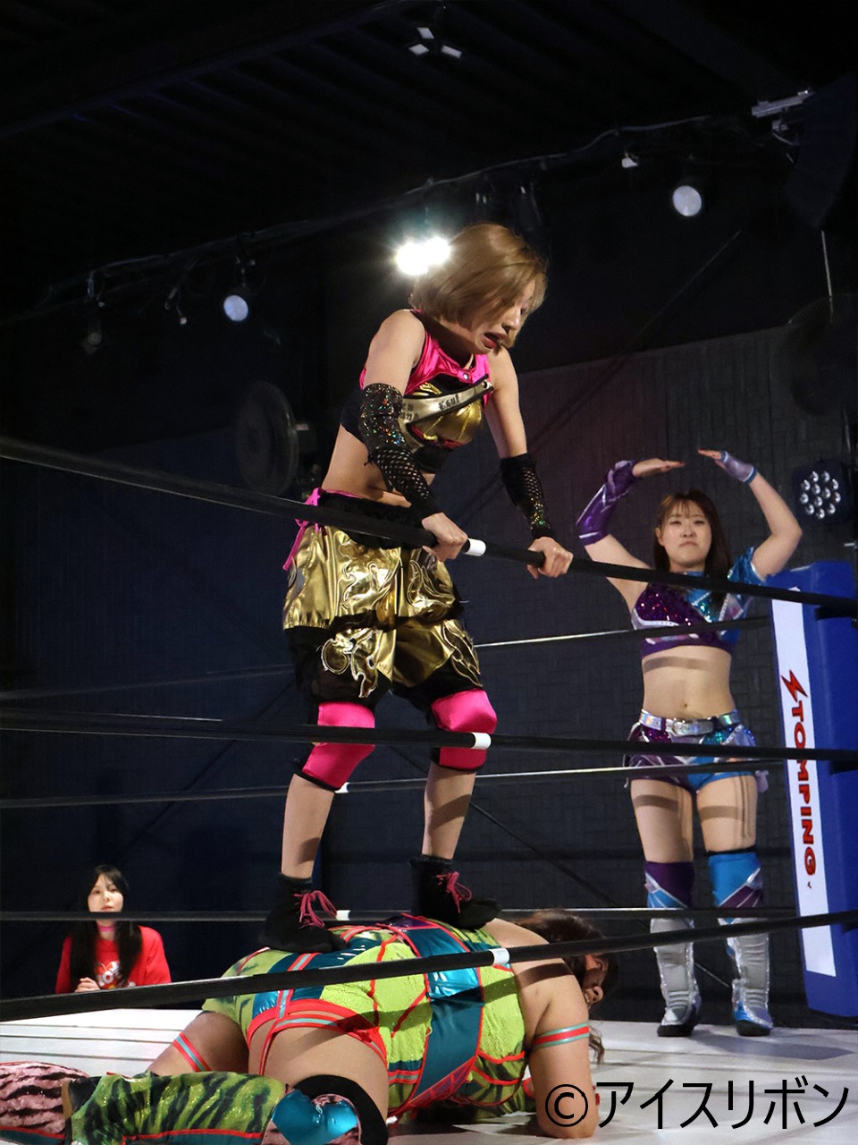 ませの飛び込みをキャッチしたYappyがませを抱え上げ、愛梨紗とレフェリーに投げつける。ませをキャッチした愛梨紗とレフェリーをYappyがキックで倒し、愛梨紗にギロチンドロップ。カバーもカウント2。