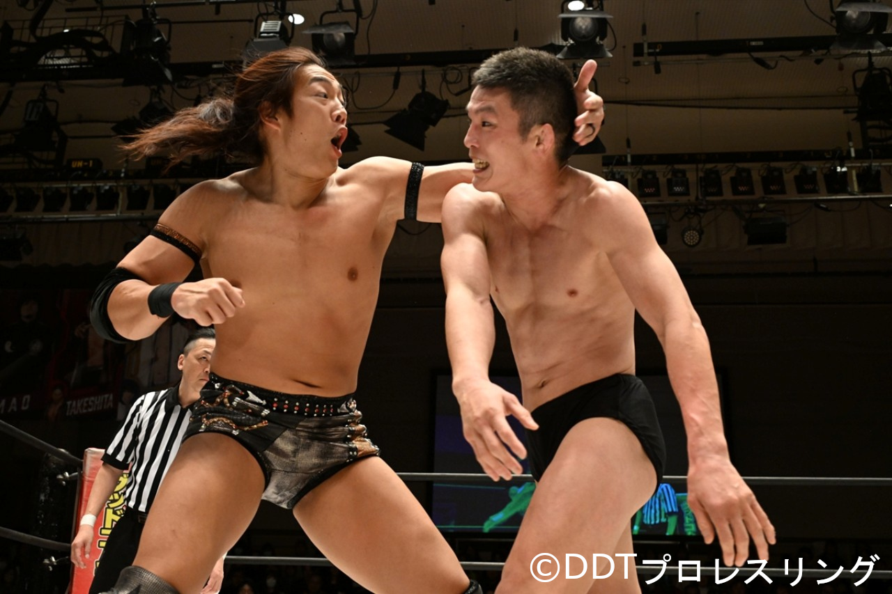 同年4月、TAKESHITAはDDTに籍を残したまま、米国に旅立ち、AEWマットで実績を残した。新日本プロレスとも契約し、今夏には「G1クライマックス」を初制覇し、10月にはIWGP世界ヘビー級王座を戴冠。11・3両国国技館で王者としてDDT凱旋を果たし、11・6新宿にも参戦。11・8福岡、11・9熊本の地方巡業にも参加。いったん米国に戻った後、青木戦のために帰国した。