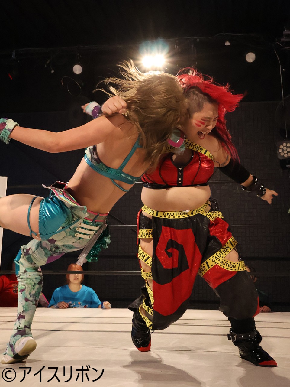 ロープに飛んだりこに海乃が飛び込みニー。海乃がフィッシャーマンズバスター。りこを引き起こしてのエルボー。りこもエルボーで返し、エルボー打ち合いから、りこがドロップキックを決めカバーもカウント2。