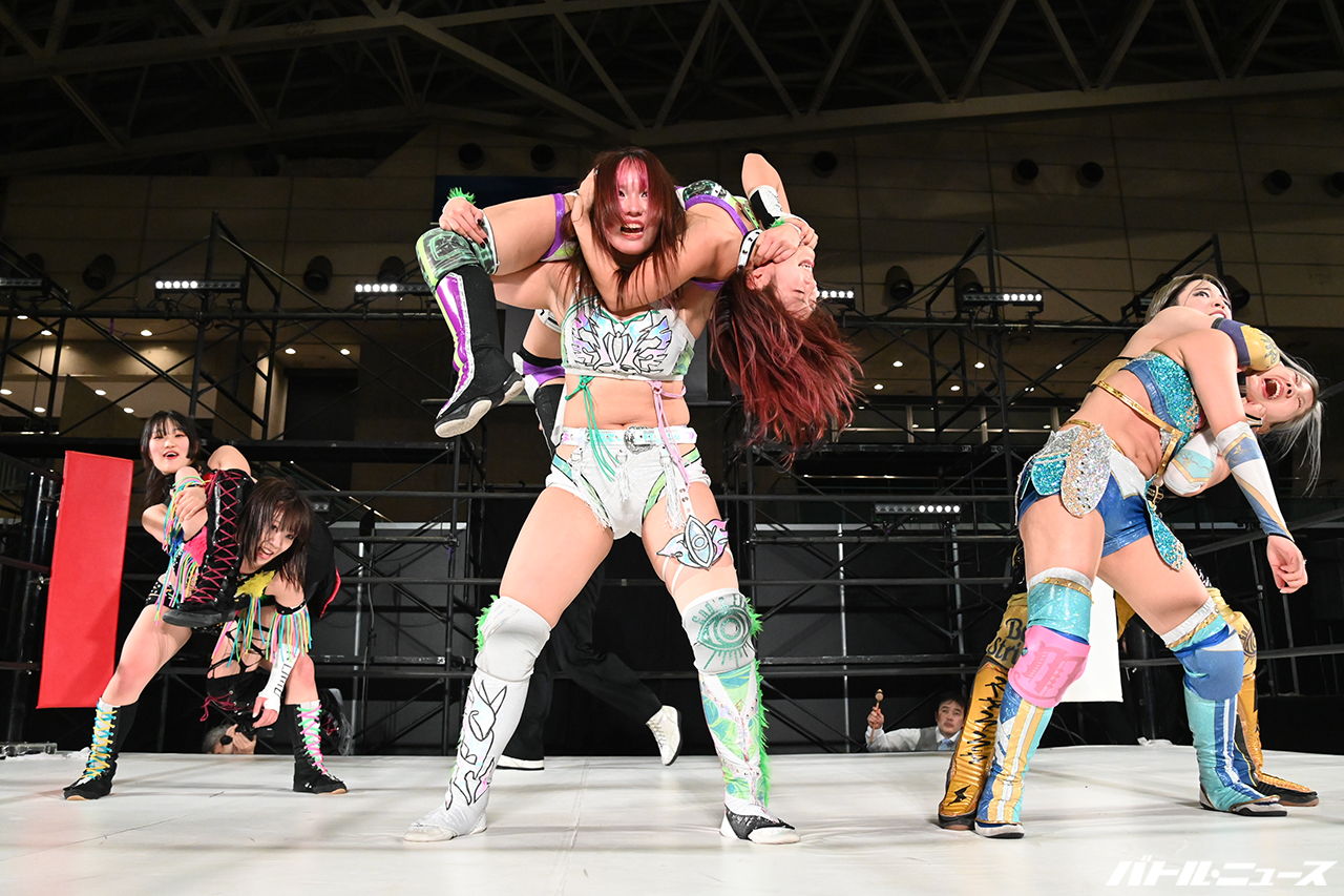 壮麗亜美(そうれいあみ)&八神蘭奈(やがみらんな)は、パンクロックなビジュアルレスラー古沢稀杏(ふるさわききょう)と急遽タッグを組み、20代ギャルユニット『NEO GENESIS(ネオジェネシス)』の星来芽依(せいらめい)&天咲光由(あまさきみゆ)&AZMと対戦。