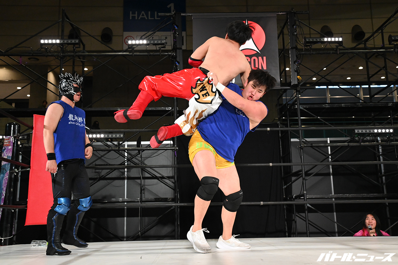ナメロとちんかわがコーナーからのダイビング急所攻撃で空気を戻しにかかるが、柔道がバックボーンの菊田が1年生とは思えない払い腰やブレーンバスターで迎撃。エースが七色のバックブリーカーでナメロの腰を使えないようにし、ヨク・タツに龍神部屋で集中砲火。ヨク・タツはダイビング・シャイニングウィザードと大技を繰り出すも、エースとヘイストでダブルのトラースキックを叩き込み動きを止め、ヘイストが牙狼剣一撃(=無双)で叩きつけ16分超えの試合に終止符を打った。