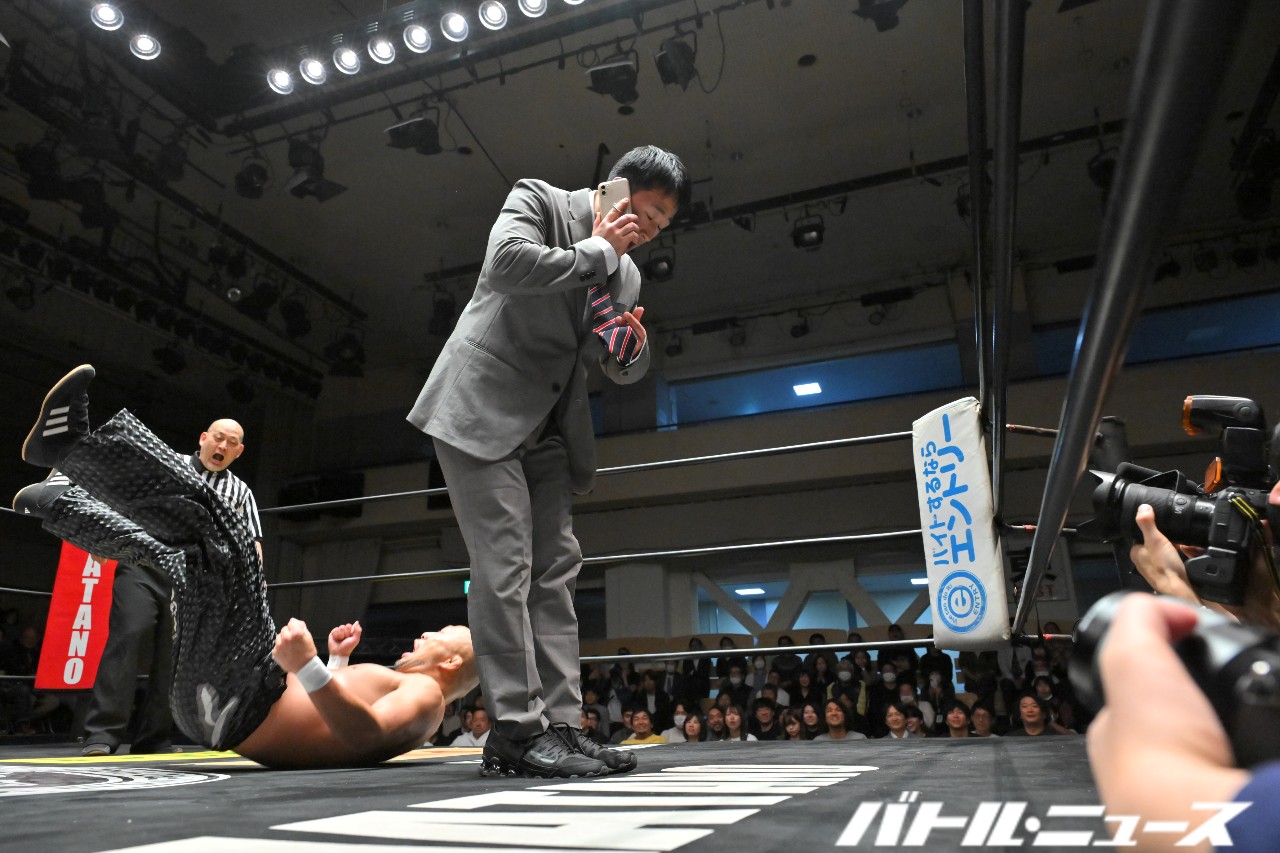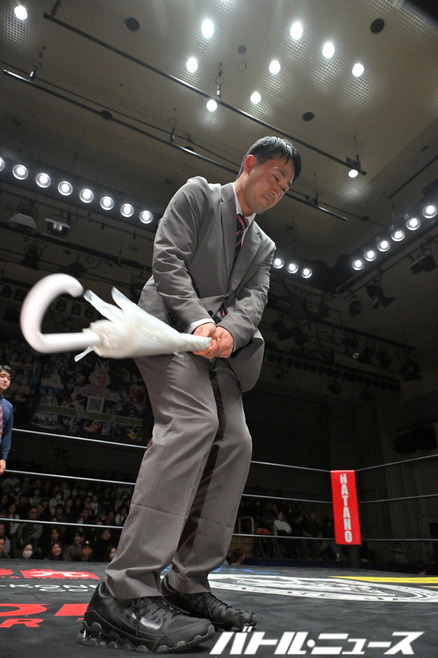 新橋は「今日こそ勝たせていただきます!」と、ビジネスバッグの中から取り出したスチール製の菓子折りの箱で殴りかかるが、パンチにあっさり奪われ頭をぶん殴られる結果に。バタリと倒れ込んだ新橋をパンチがカバーして3カウント。観衆は皆笑顔でパンチへブーイングを贈った。