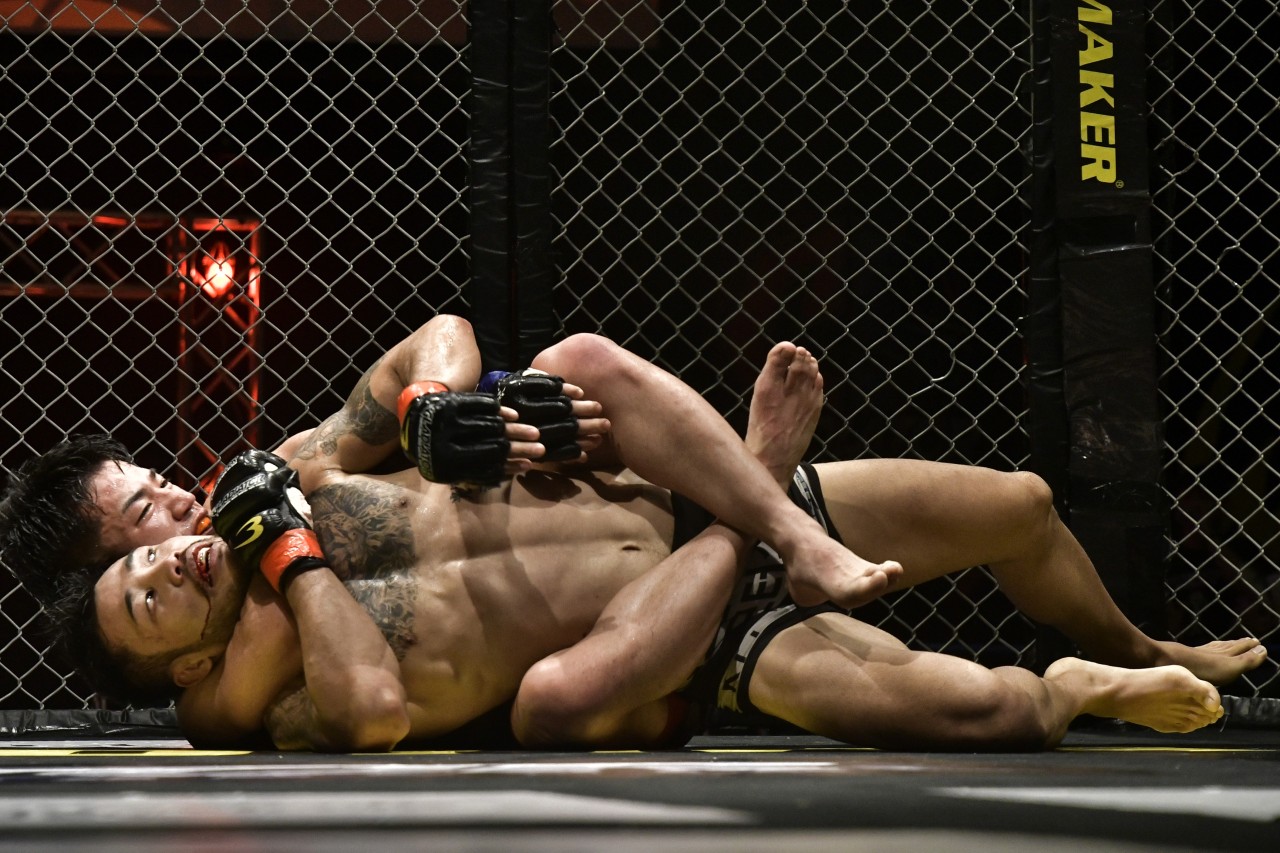 2R、タッキーのロー蹴りのタイミングで諸井が組んでいきタッキーをケージに押し込む。ケージを背負わされたタッキーが諸井のボディに膝を入れる。諸井がテイクダウン。下になったタッキーの顔つきに消耗の様相が浮かぶ。抗うタッキーのブリッジを上四方でおさえてアメリカーナ。