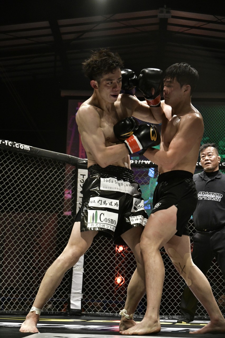 2R、肩で息をする両者。セコンドの「手伸ばして」に右ローを出す松本。土井が前に出て来た松本を首相撲で捕えて膝。松本も粘ってがむしゃらに拳を振っていく。土井が首相撲で膝。エンジン全開の松本がクリンチアッパーからパンチ連打。ダブルレッグで尻もちつかせテイクダウンに成功してパウンド。亀になる土井がケージを使って立つがまたもダブルレッグ、テイクダウンでパウンド。レフェリーが試合を止めた。