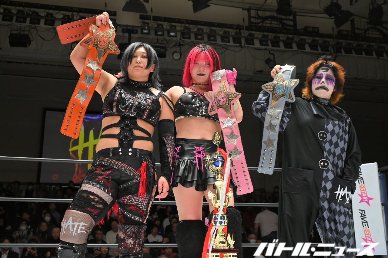 アーティスト王座はユニットの絆が試されるベルトだが、H.A.T.E.の3人は元々は故・木村花さんが創ったユニット【TOKYO CYBER SQUAD】の出身。絆の深さは相当なものであり、反則攻撃だけではなく確かなコンビネーションで攻め立てていく。