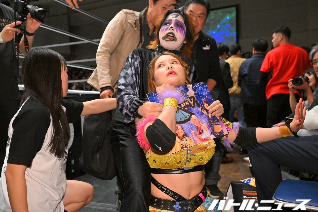 マイクを取った吏南は「アーティスト、2度目の防衛成功したぞ!久しぶりの防衛戦にはなっちゃったけど、アーティストのベルト面白いって、今日みんなまた再確認できたでしょ?」と不敵な笑み。
