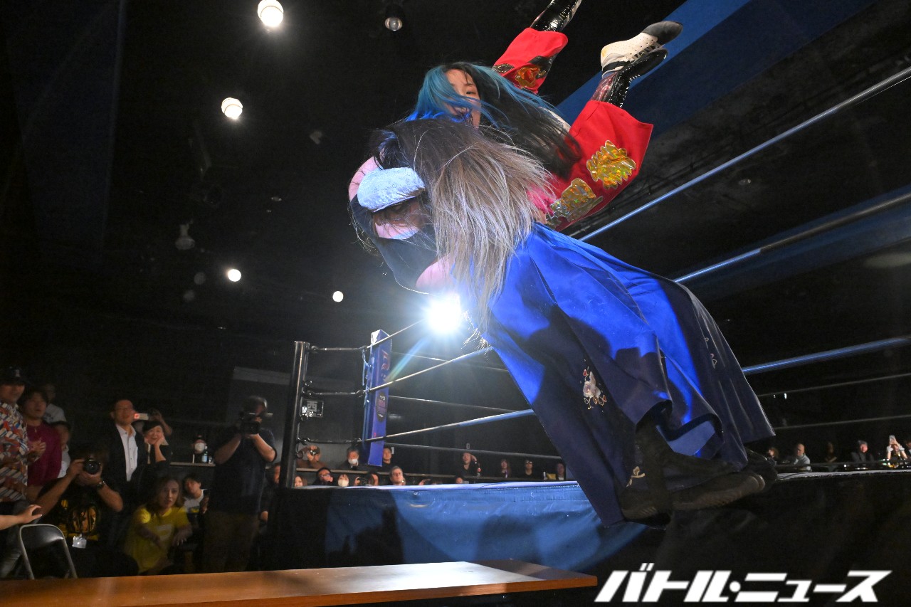 それでも世羅はイスを両腕に絡めるサブミッションやラダーを巧みに使っての攻撃とハードコア経験値の高さを見せて逆転。エプロンから場外にセットしたテーブルへの羅紗鋏を見舞うなどハードコア初心者にも容赦ない一撃を加える。