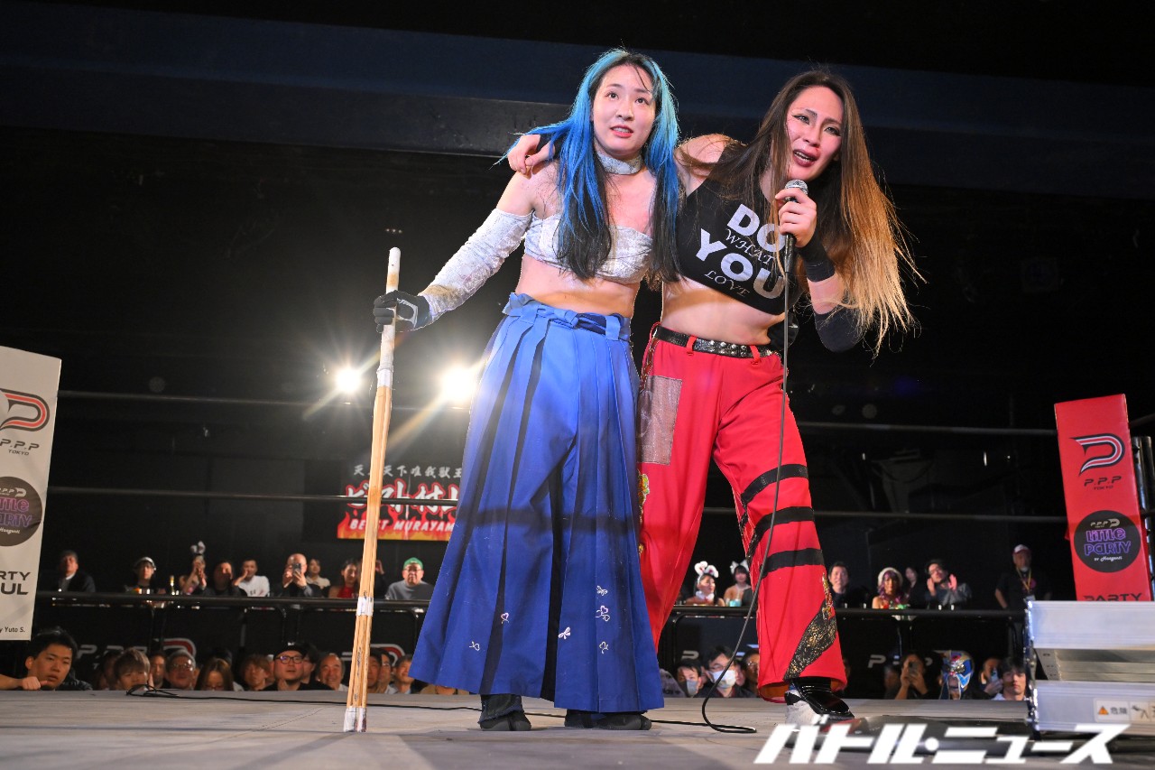 そして「私はたった4試合しかしてないけど、貴女からハードコアを継承したいです」と後継者に名乗り。世羅も「もちろん!これからのエチカ・ミヤビのハードコア路線、楽しみにしてます」と快諾して笑顔で肩を組み合った。