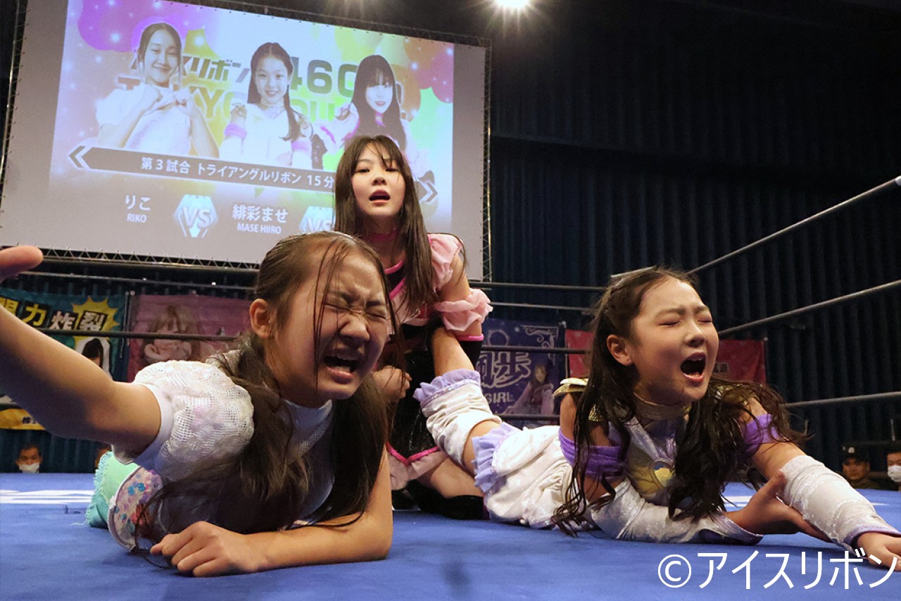 大晦日の後楽園ホール大会でトライアングルリボン王座への2度目の挑戦が決めったませ。小中学生のみの初のトライアングルリボン戦。開始早々、試合をストップしたませが「私と組みたい人は?」と尋ねるも、りこともえはこれを無視して手四つへ。ませが2人の間に飛び込もうとするが、りこともえがクローズラインでませを倒してりこがカバー。もえがりこをどけてカバー。フォールの奪い合いからりこがもえにエルボー連打、ミサイルキックでカバーもカウント2。