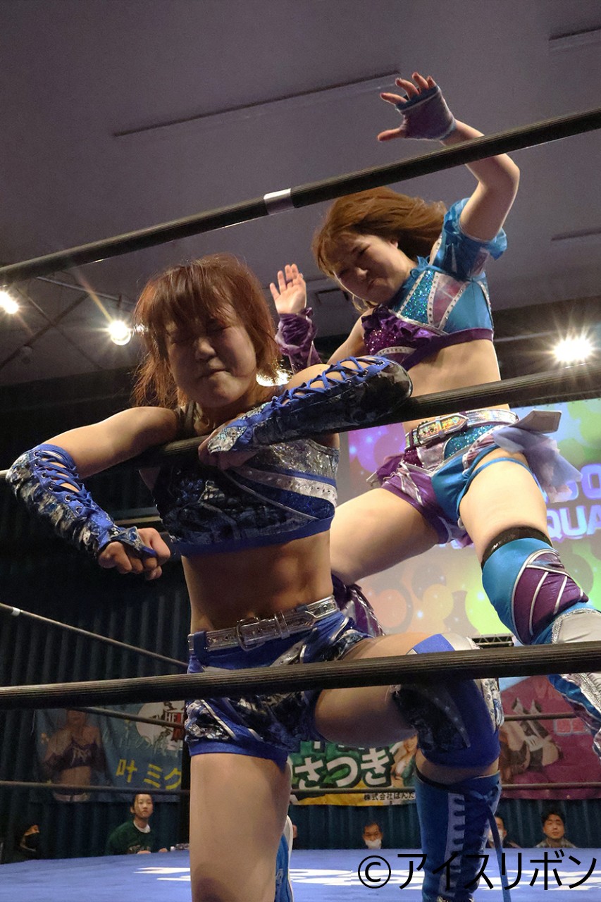 楓歩が逆エビ固め。ロープに逃れる。楓歩が飛び込みもカニばさみでかわしたミクが飛び込みドロップキック。楓歩を場外に落とすと、コーナーからのプランチャ。楓歩をリングに戻してのダイビングボディアタック。カバーもカウント2。