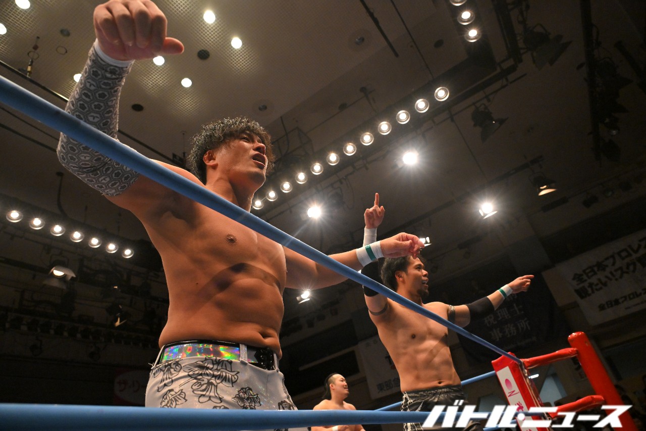 土井らは3人でトレイン攻撃 安齊のフロント・スープレックスから土井のサンセットフリップ、ジュンのエルボードロップと連撃が決まる。土井が追撃を狙うとISHINが場外に逃れ「場外でやろうぜ!土井ちゃん!」と挑発。しかし、全日本の場外カウントはドラゲーと違って20ではなく10であることに気づき、慌ててリングに帰還。今度は土井が場外に出て「来いよ来いよ」と挑発。ISHINが応じずにいると土井がリングに戻ろうとするが、ロープをまたいだところで蹴り上げて急所攻撃。菊田にタッチ。