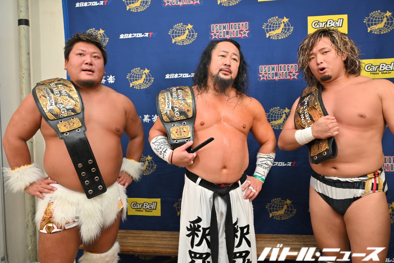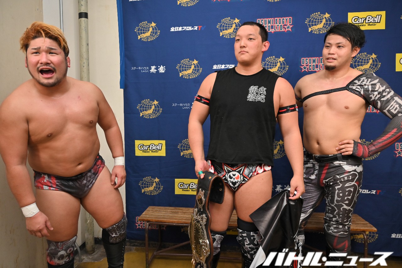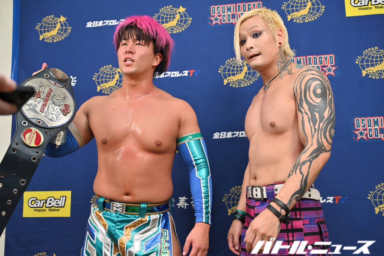 ISHIN「OK!OK!OK!オイ全日本プロレスゥ!菊田円がドリームゲートチャンピオンとして全日本プロレスに帰ってきたぞオイ!ヘイヘイヘイヘ~イ!そういうことだオラ!それから加藤良輝が言ったみたいに、俺と加藤のチーム204kgがむーちゃんせーちゃんの持つアジアタッグに挑戦するぞ。アイツらがむーちゃんせーちゃんならよ、俺たちはいっちゃんよっちゃんで挑戦してやるよ!オイ!アジアタッグ、生え抜きじゃねーお前たちが巻いているところでな、アジアタッグのベルトがまいてんだよ、泣いてんだよコラ!噛むことだってあるんだよオラ!噛んじまったから、最後良輝が喋るぞオラッ!」
