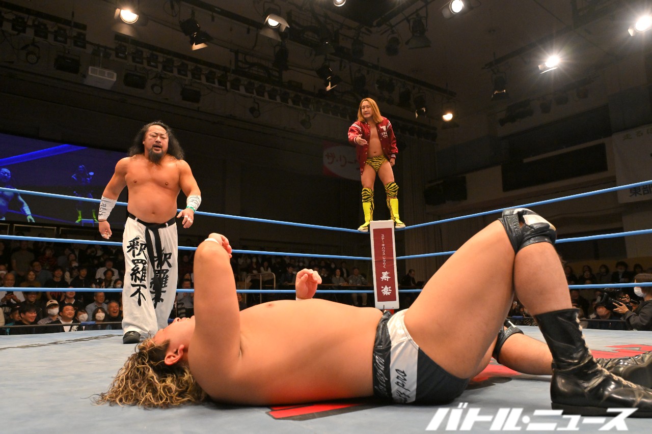 黒潮はコーナーに上がって「セットしろ!」と指示するも、他花師のセットした位置が遠すぎて飛べない。もっと近づけるよう指示するが、今度は近すぎて飛べない。3度目はちょうどいい位置にセットも、今度は他花師の観衆へのアピール邪魔で飛べない。黒潮が「邪魔だよッ!」と他花師を突き飛ばして仲間割れ。その間に北斗が黒潮にRKO。さらに他花師が北斗に地獄突き連打も、黒潮が突っ込んできて黒潮&他花師をダブルのクロスボディで倒してセントーン。
