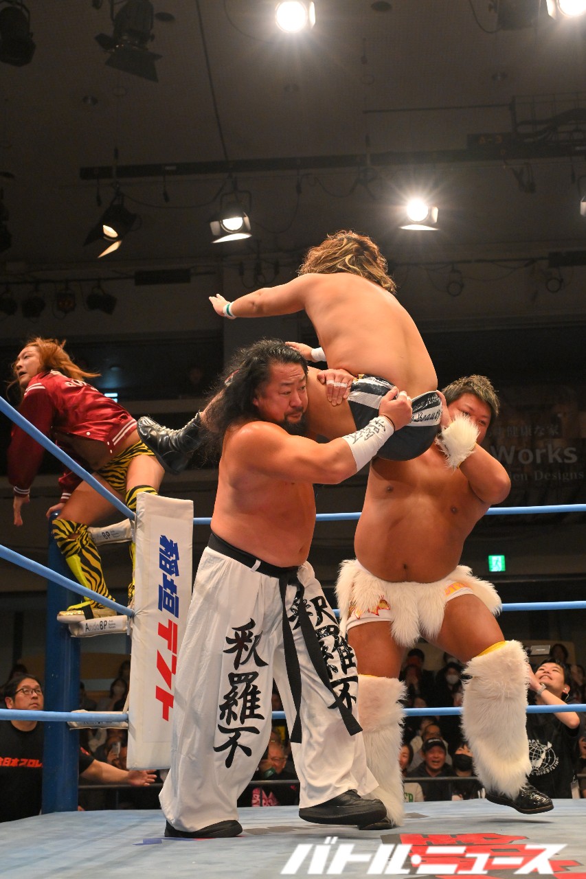 羆嵐が他花師にアルゼンチン・バックブリーカーも、黒潮が羆嵐の股間を掴んで救出しトラースキックを放つも他花師に誤爆。今度は北斗が黒潮を羽交い締めにする中で羆嵐ラリアットを放つも、これが北斗に誤爆。