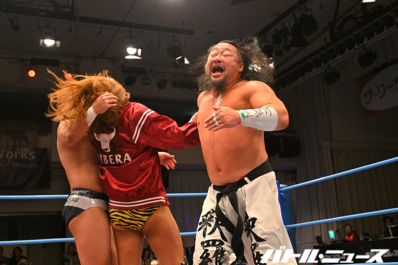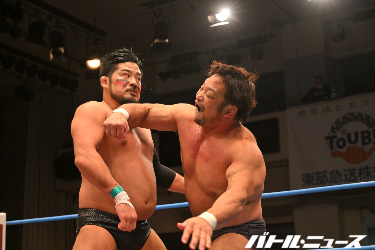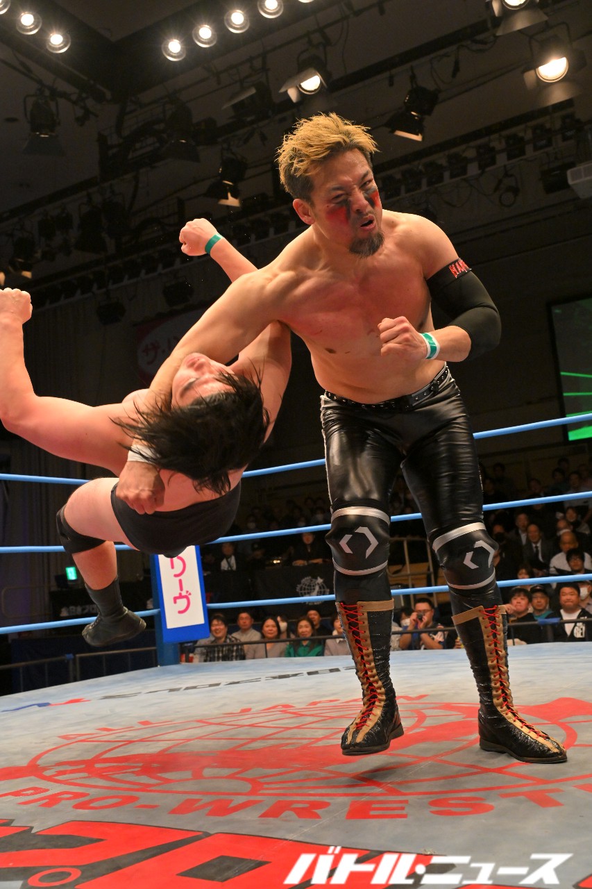 野村は本田にドロップキックからショルダータックル連打。さらにノーザンライト・スープレックス・ホールドからデスバレーボムを狙うが、本田が振り払ってエルボー合戦に持ち込む。ゴツゴツとした撃ち合いが続き、野村が左右のエルボーでラッシュ。本田はふらつくも、渾身のラリアットで叩き伏せる。野村もスピアーを発射も、本田が受け止めてブレーンバスター。しかし野村もクラッチを話さずぶっこ抜いてブレーンバスター。本田が再びラリアットを叩き込むと、両者大の字となりダブルダウン。両者タッチ。