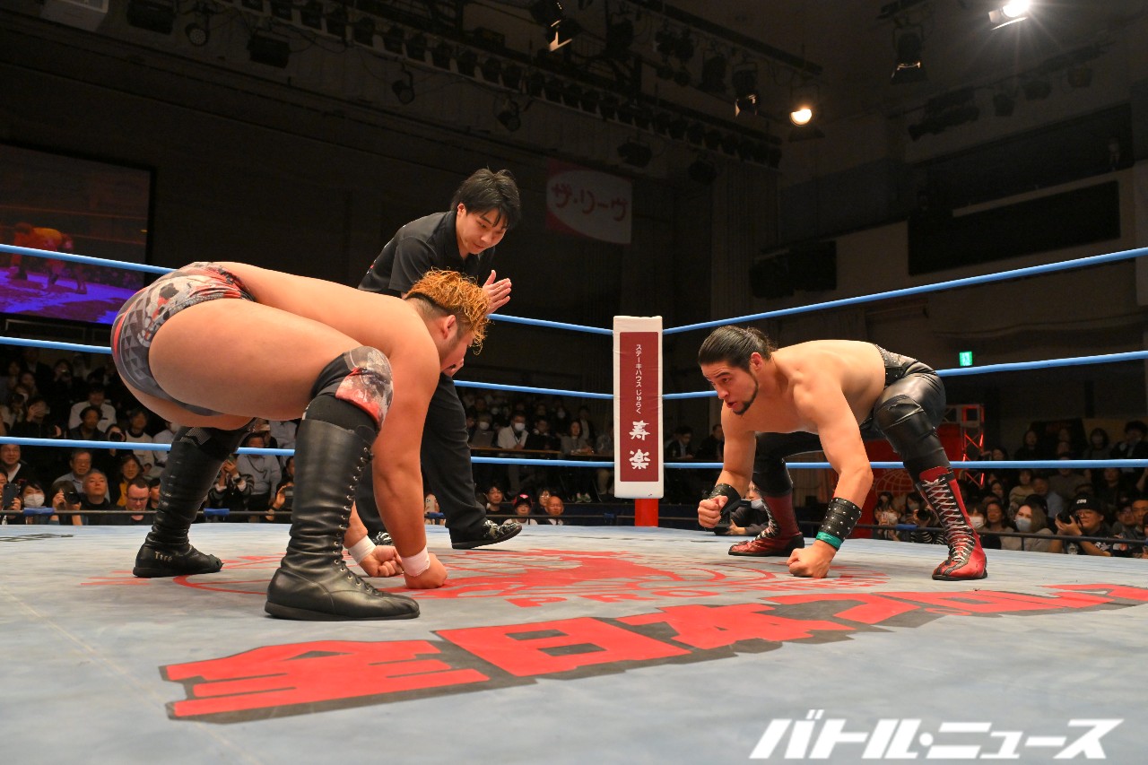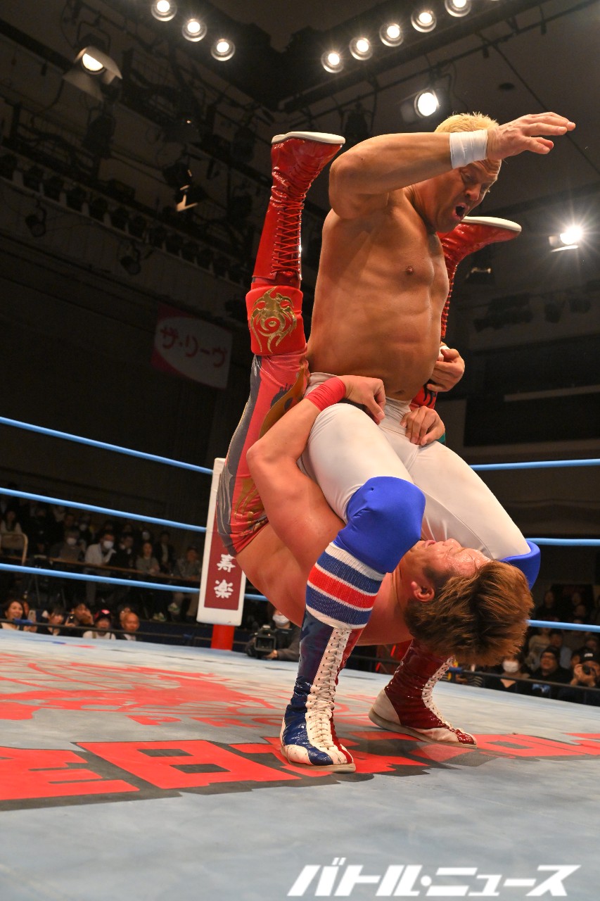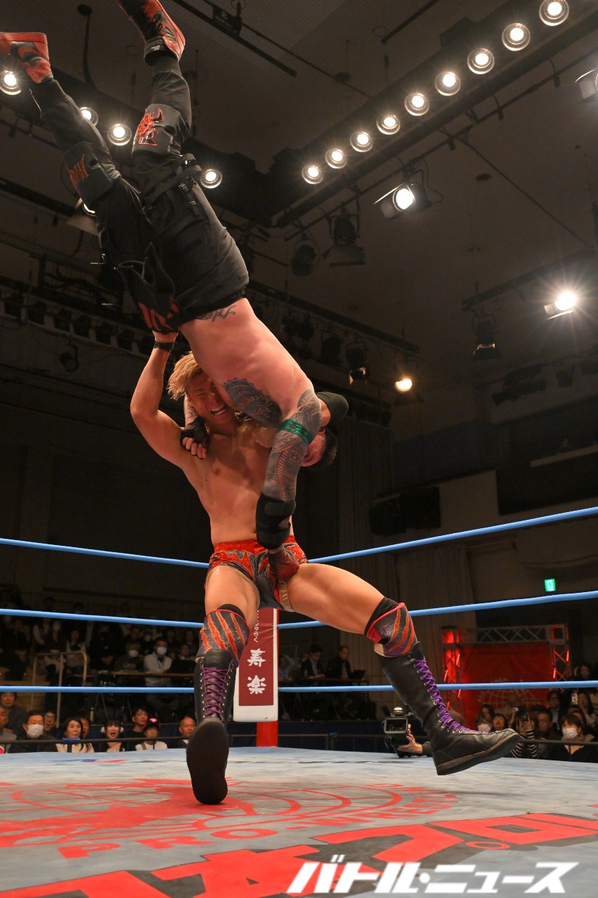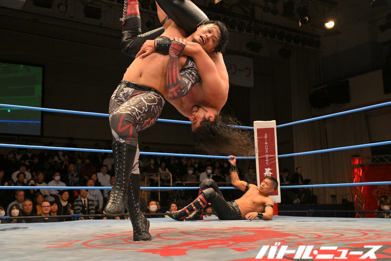 野村は本田にドロップキックからショルダータックル連打。さらにノーザンライト・スープレックス・ホールドからデスバレーボムを狙うが、本田が振り払ってエルボー合戦に持ち込む。ゴツゴツとした撃ち合いが続き、野村が左右のエルボーでラッシュ。本田はふらつくも、渾身のラリアットで叩き伏せる。野村もスピアーを発射も、本田が受け止めてブレーンバスター。しかし野村もクラッチを話さずぶっこ抜いてブレーンバスター。本田が再びラリアットを叩き込むと、両者大の字となりダブルダウン。両者タッチ。
