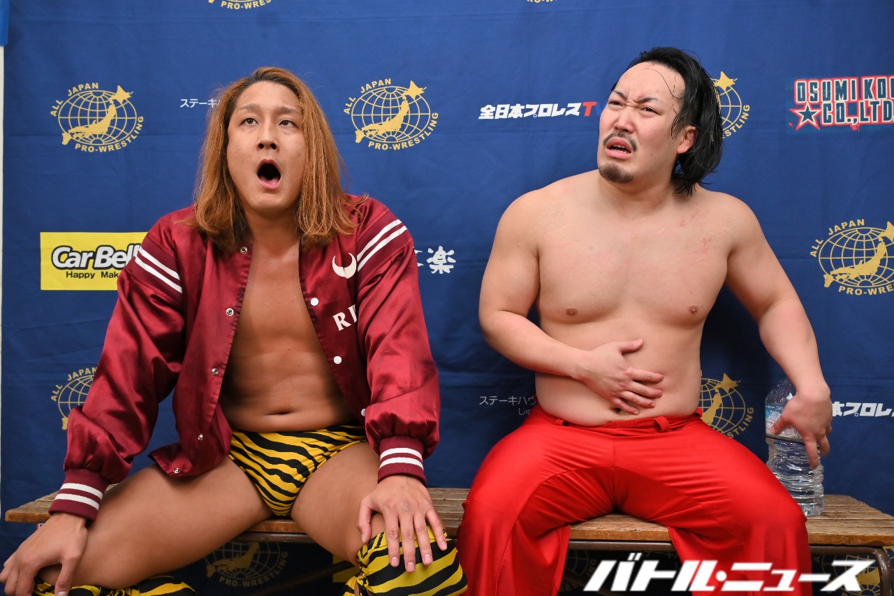 MUSASHI「あのね、あの、今日全日本プロレスに乗り込んでくるのは知ってたけどさか、まさかむーちゃんせーちゃんとタイトルマッチやりたいとは思ってなかったからさぁ!早くゆってよぉ~!やるに決まってんじゃん!見て、せーちゃんもやる気満々の顔。見てよホラ!(※吉岡はMUSASHIのテンションに引いている様子)やるよぉもぉ~!早くゆってぇ?で、いつやるよ?あっ、そーか。いきなり全日本プロレスに来てね『この日にやらせろ!』なんて言いにくいよね。2人ともね。任せて!俺が全日本プロレスとPWFにしっかり言っとくよ、責任持って。だから、やろーよ!決まりだよ!やろう?!やるよ、せーちゃん!やりたいでしょ、せーちゃんも!この2人熱いもん、だって!いきなり全日本のリングに来て『アジアタッグに挑戦させろ』なんて言えないよ普通!ね?やろう!決定だよ!やるぞ!任せとけって!絶対決めるから!やらないなんて言わせない。絶対責任もってやらせるから!な!」