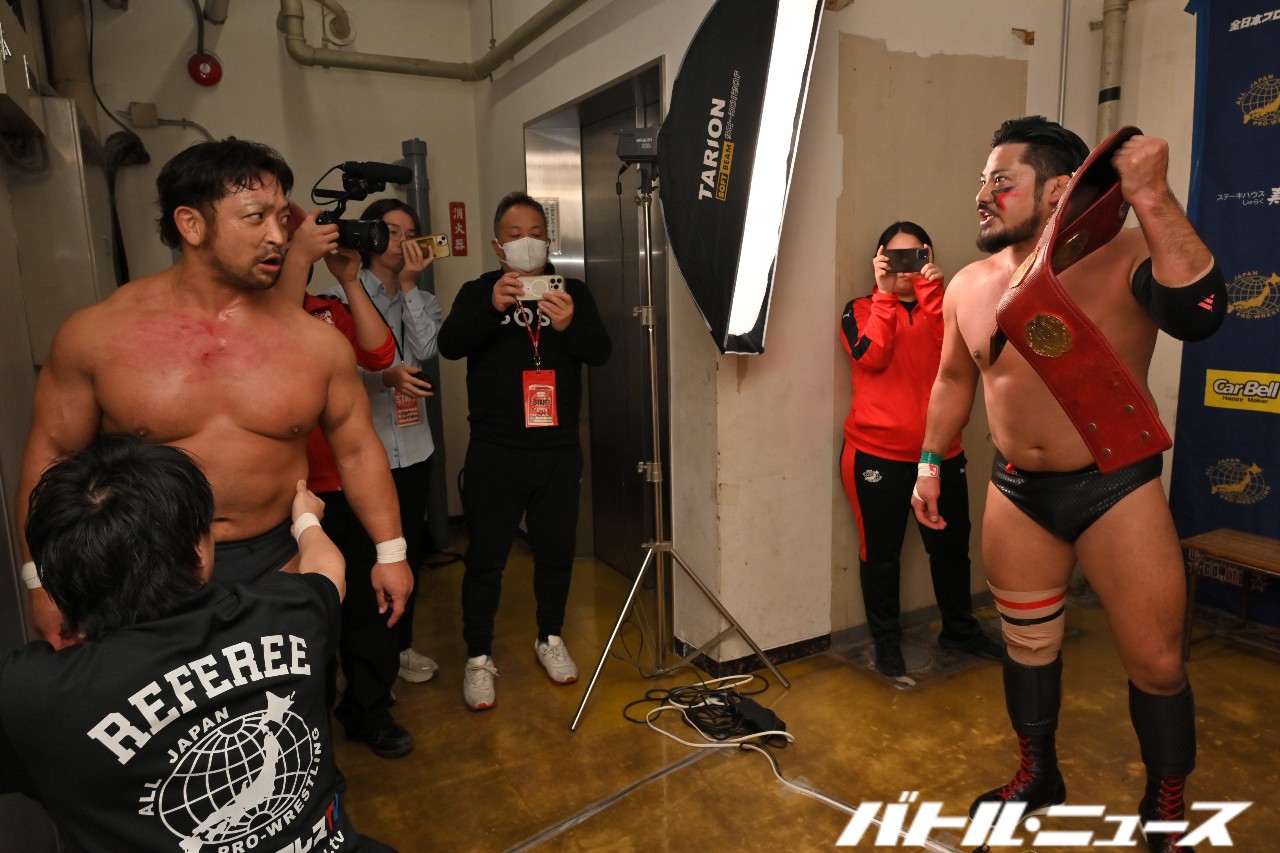 MUSASHI「お前らよ、俺たちのことわざわざリングに呼び出してなに言うのかと思ったら?生え抜きじゃねーとか?気持ちがねーとか?なに言ってんだよ。俺とせーちゃんは全日本プロレス大好きなんだよ。そんなお前らに、このベルト挑戦できると思ってるのか?……いーじゃん!いーじゃぁん!やろーよ!やろーよぉ!熱いねぇ~ッ!なになに?早くゆってよぉ!」