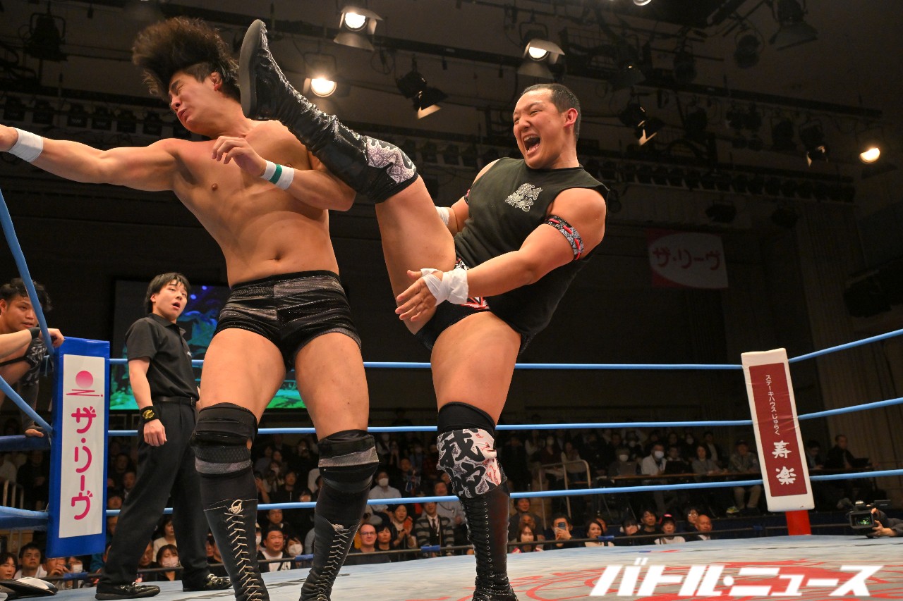リング上は亮生と立花の一騎打ちの様相。立花がカウンターのローリングエルボーを決めるが、亮生もすぐ起き上がってエルボー合戦を展開。立花が左右のエルボー連打で打ち勝ってロープに飛ぶが、亮生が旋風脚。立花も倒れずラリアットからアングルスラム。立花はヤンキーハンマーを発射も、亮生がかわし、飛び込んできたHAYATOがトラースキック。アツハヤのダブルトラースキックからダブルの変形フィッシャーマン・バスター。