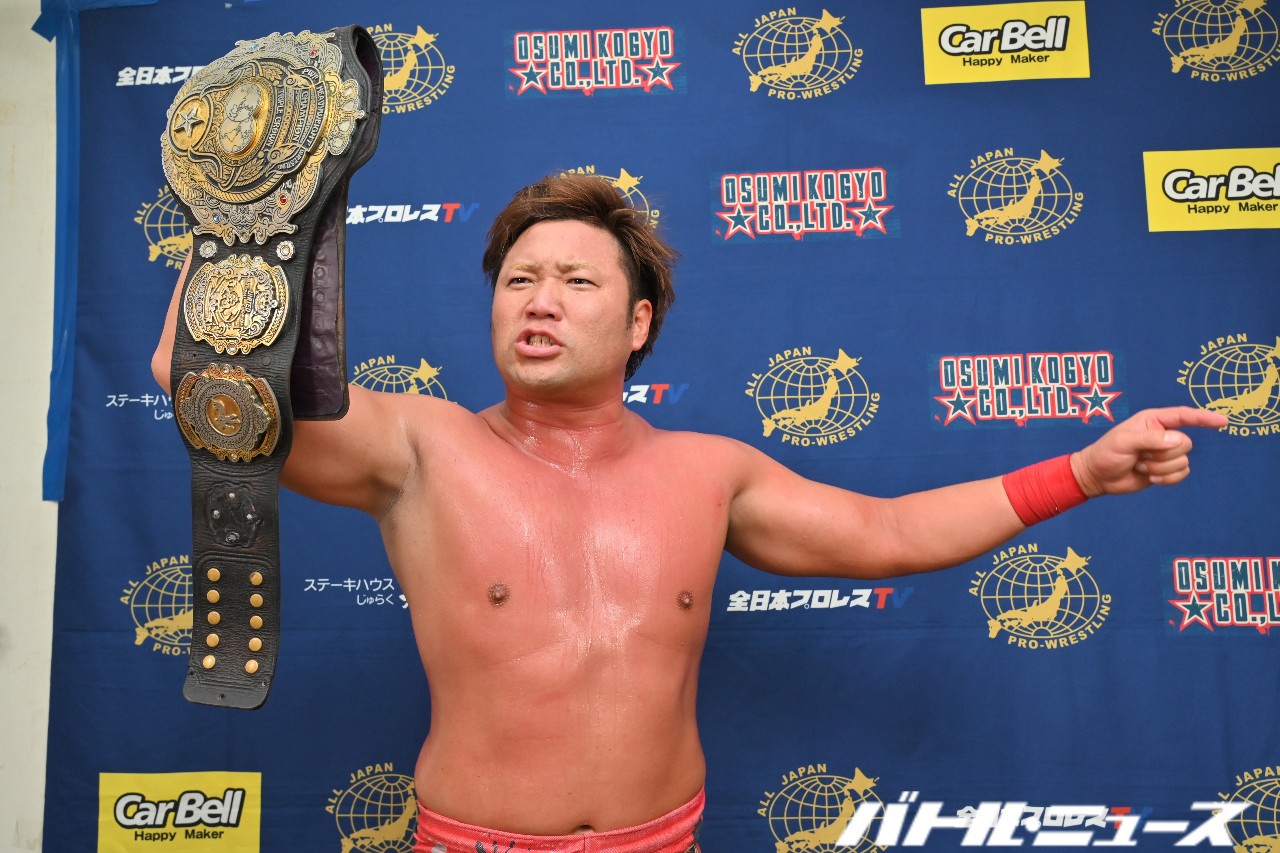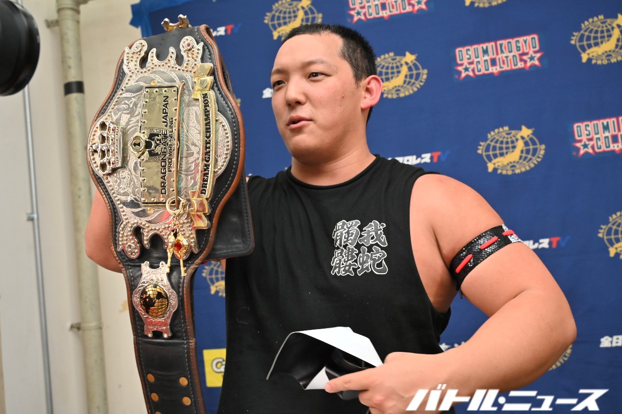 加藤「オイ!全日本プロレス。オイ、初参戦で初勝利、初マイクやらしてもらうぞ。(※ブーイングを制して)待て待て待て。今回は個人的な話からいかせてもらう。俺はある男に全日本プロレスの入門試験を落とされているんだよ。その後、俺はもう1つの夢であった警察官になり、今ここにいるわけだ。お前らに1つ聞いてやる。俺がどこで働いていたか知っているか?(※観衆の1人が「長野県警!」と叫ぶ)……勘のいい奴がいるなぁ(笑)俺が働いていたのは長野県松本市。……まぁ全日本プロレスには関係ない話だけどよ。そしてそして、長野県はとってもいいところだ。景色もいい、飯も美味い。ただな、もちろん住んでる奴、出身者の奴がそうとは限らない。知っての通り、長野県は田舎だからよ、車社会なわけだ。毎日毎日、何件も何十件も交通事故を処理してよ!俺の仕事もままならねぇわけだ。まぁこれも全日本プロレスには関係ない話だったな。まだまだ、もうちょっとだけ俺と遊んでくれないか?ここからが本題だオイバカヤロー!俺が今日ここに来た理由、それは俺を落とした全日本プロレスへの復讐だ。何の因果かここに立っている。俺が現在、DRAGON GATEの加藤良輝として、テメーら全日本プロレスファン、全日本プロレス所属選手たち、コイツらにできる最大の仕打ちは、ベルト巻くことだろ。まぁ正直全日本のベルトの価値とか分からねぇけどよ、まずは手始めに俺とISHINで、ISHINのだ~い好きなジャイアント馬場が巻いたことのある最古のタッグベルト!アジアタッグに挑戦させろ!オイ!アジアタッグのチャンピオンチーム、こんだけ外敵の若者にウダウダ言われて、出てこないわけないよなぁオイ!来いよチャンピオン!俺たちの圧倒的な強さにビビったかオイ!」