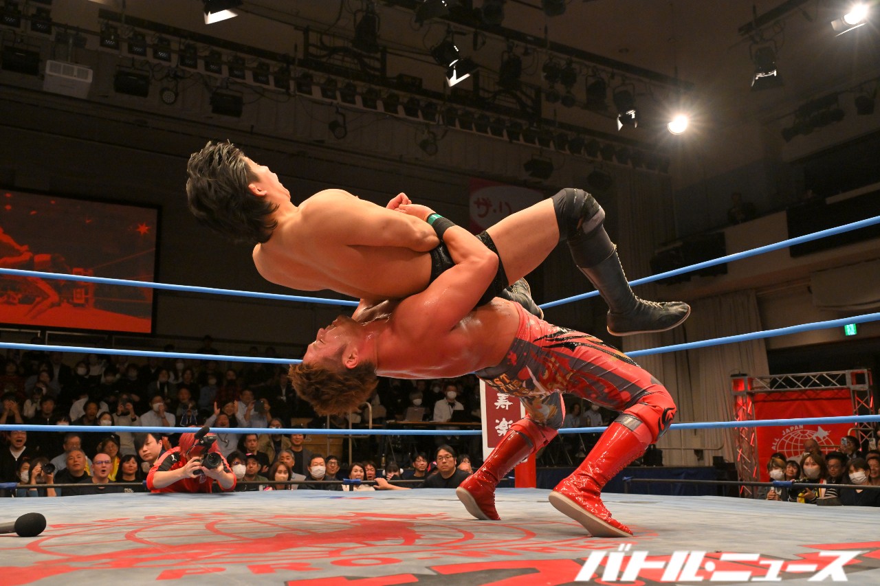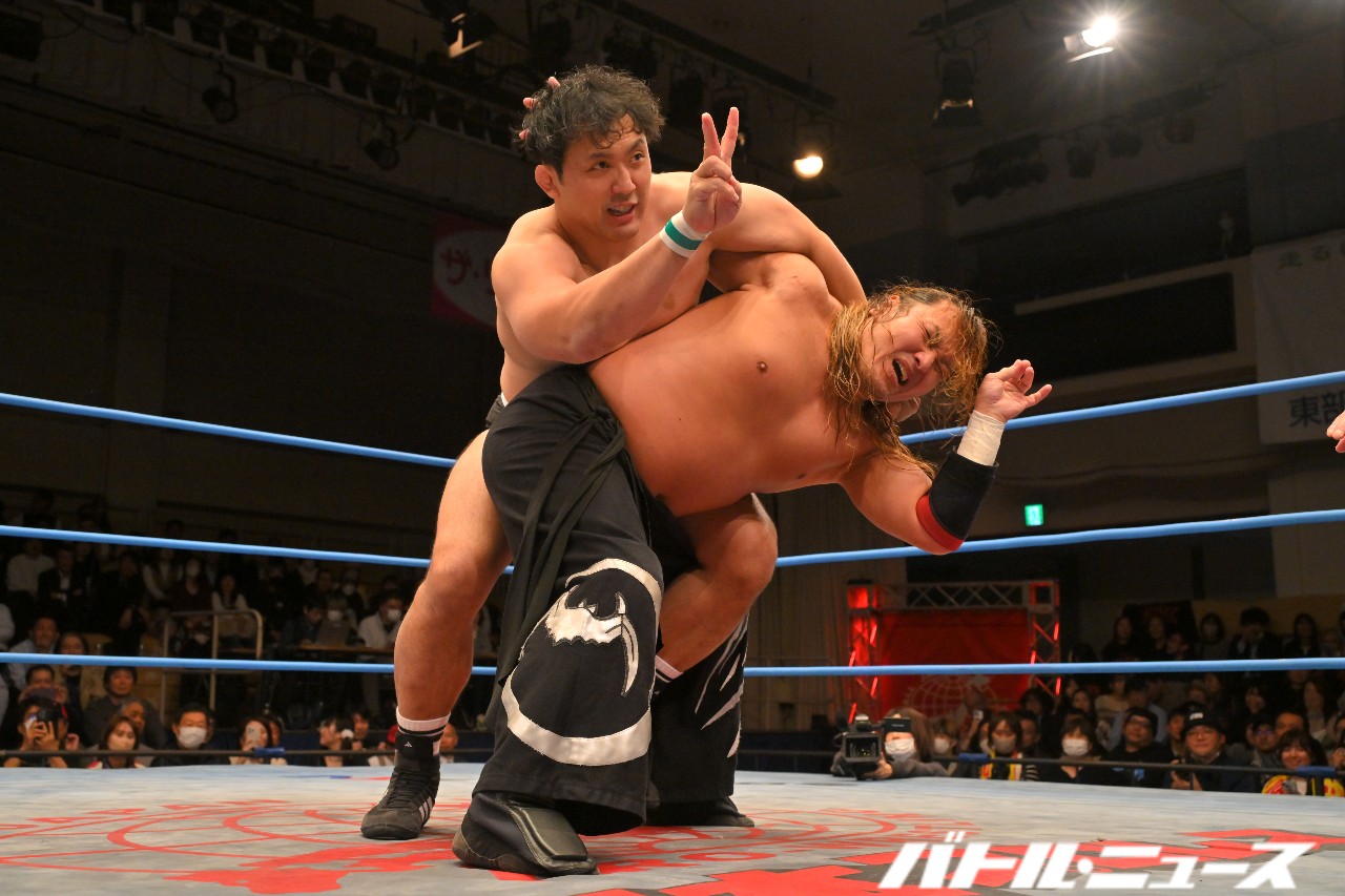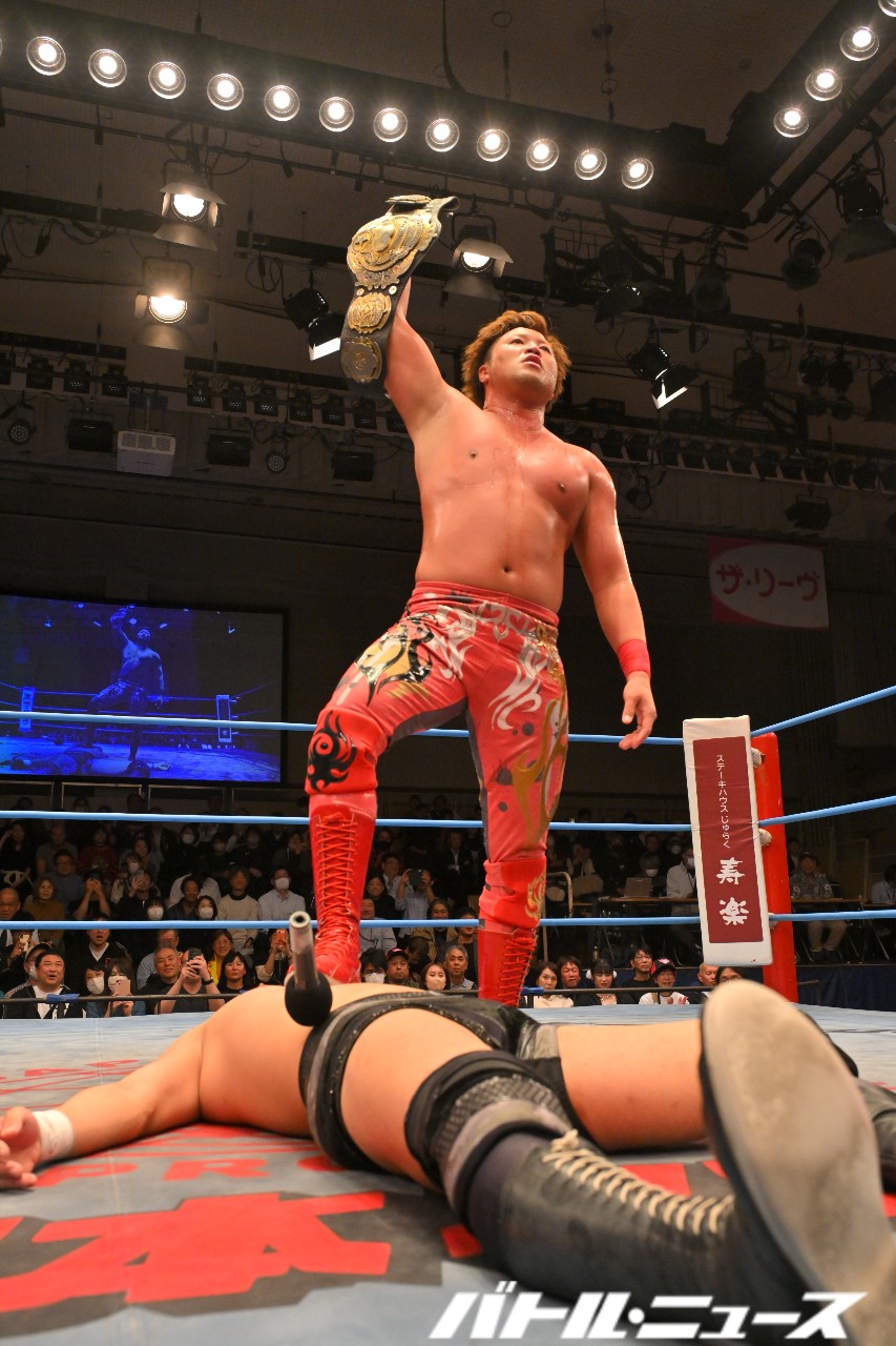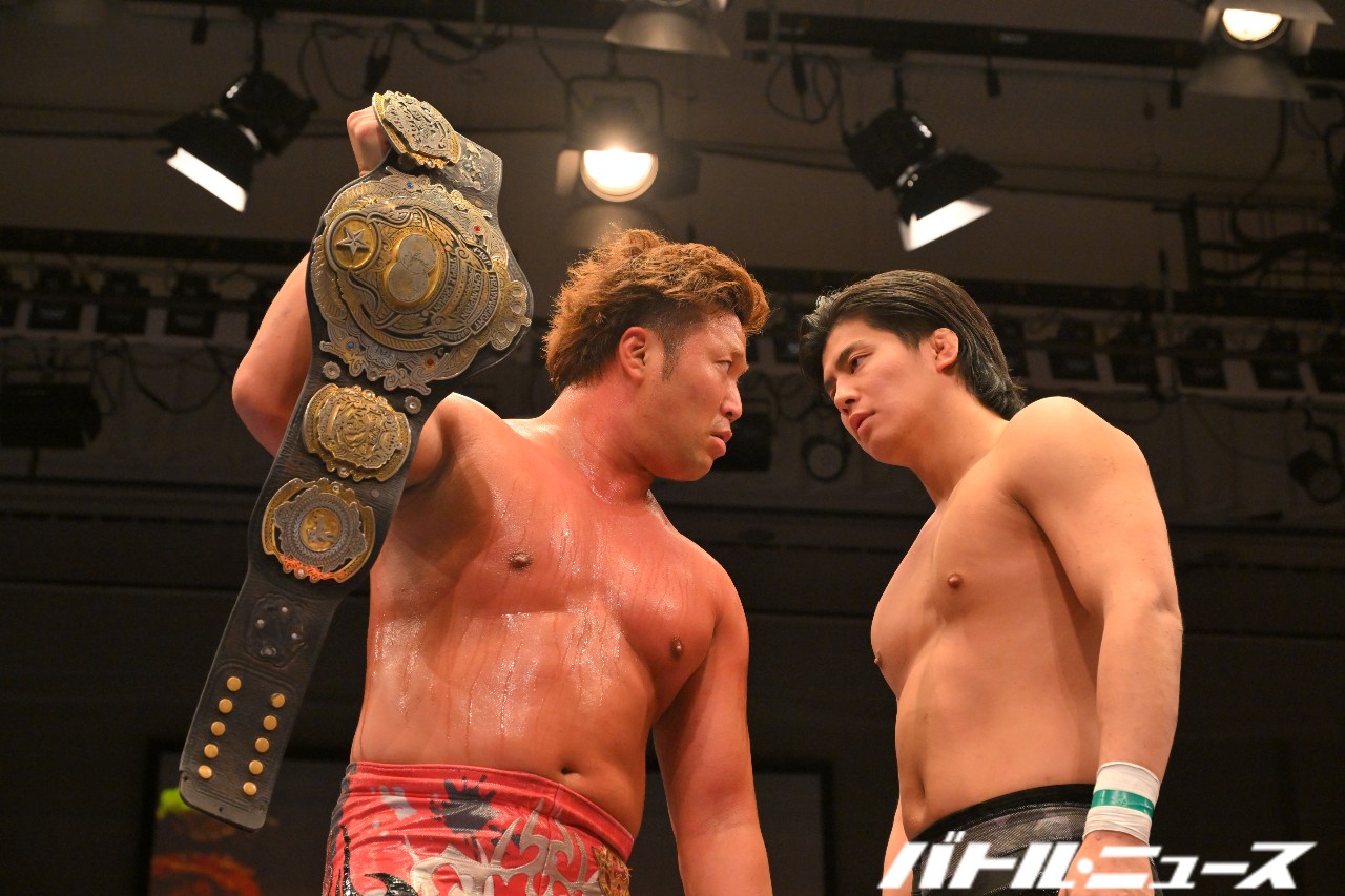 宮原が安齊の眼前にベルトを掲げて睨み合う。安齊が背を向けると、宮原が組み付いてシャットダウン・スープレックス。安齊を踏みつけながらマイクを取る。