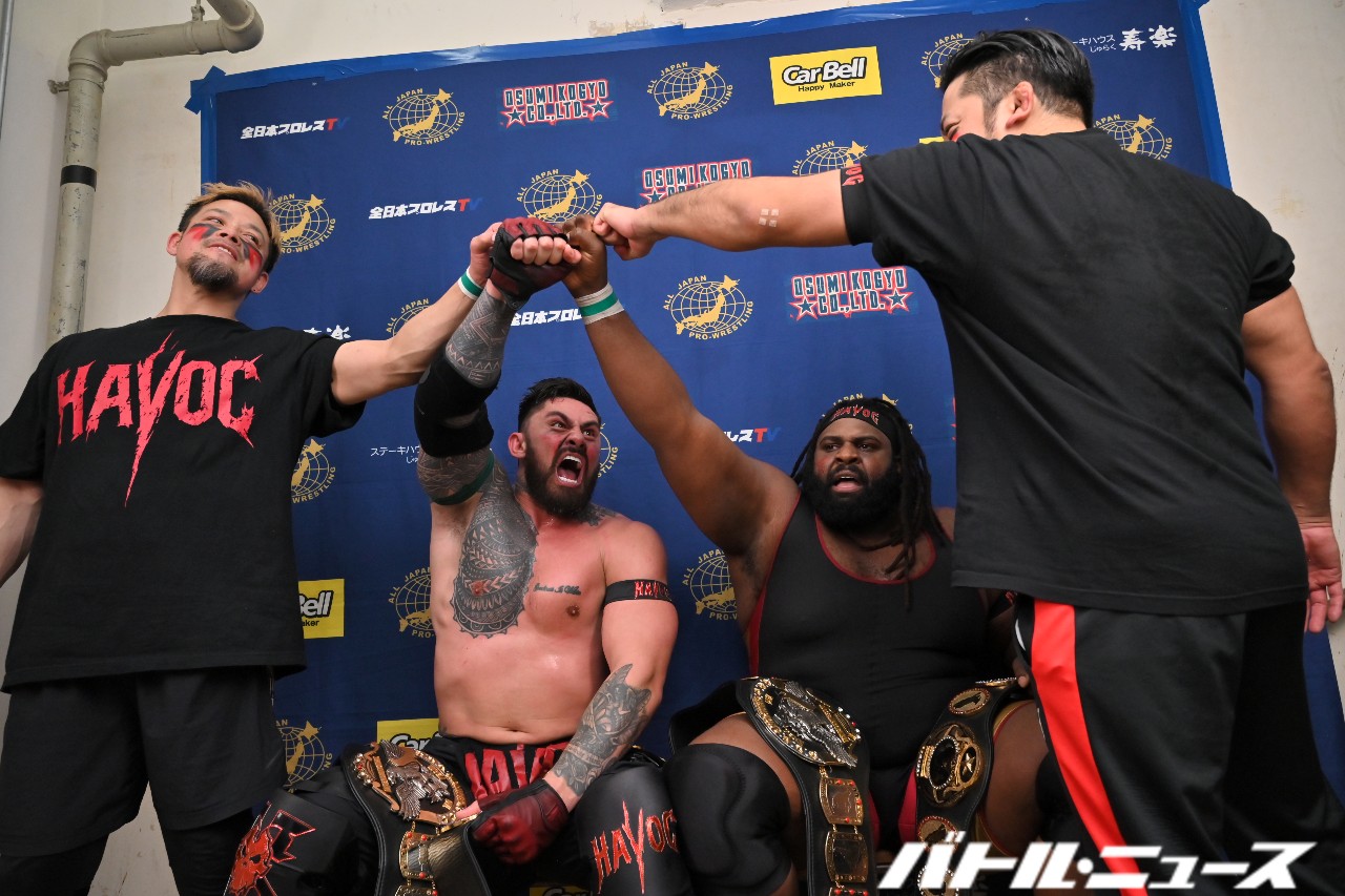 オデッセイはタロースをリングに戻し、エルボードロップ連打からボディプレス。さらにオデッセイのバックドロップ+ザイオンのネックブリーカーの合体技を決め「オレタチハー!HAVOC!」と拳を合わせながら叫ぶ。