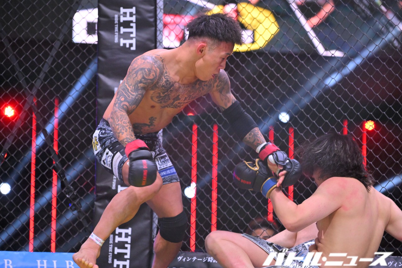 関谷が右フックも、ガードした野嶋がスイッチしながらワンツーでケージに押し込みクリンチして膝もブレイク。