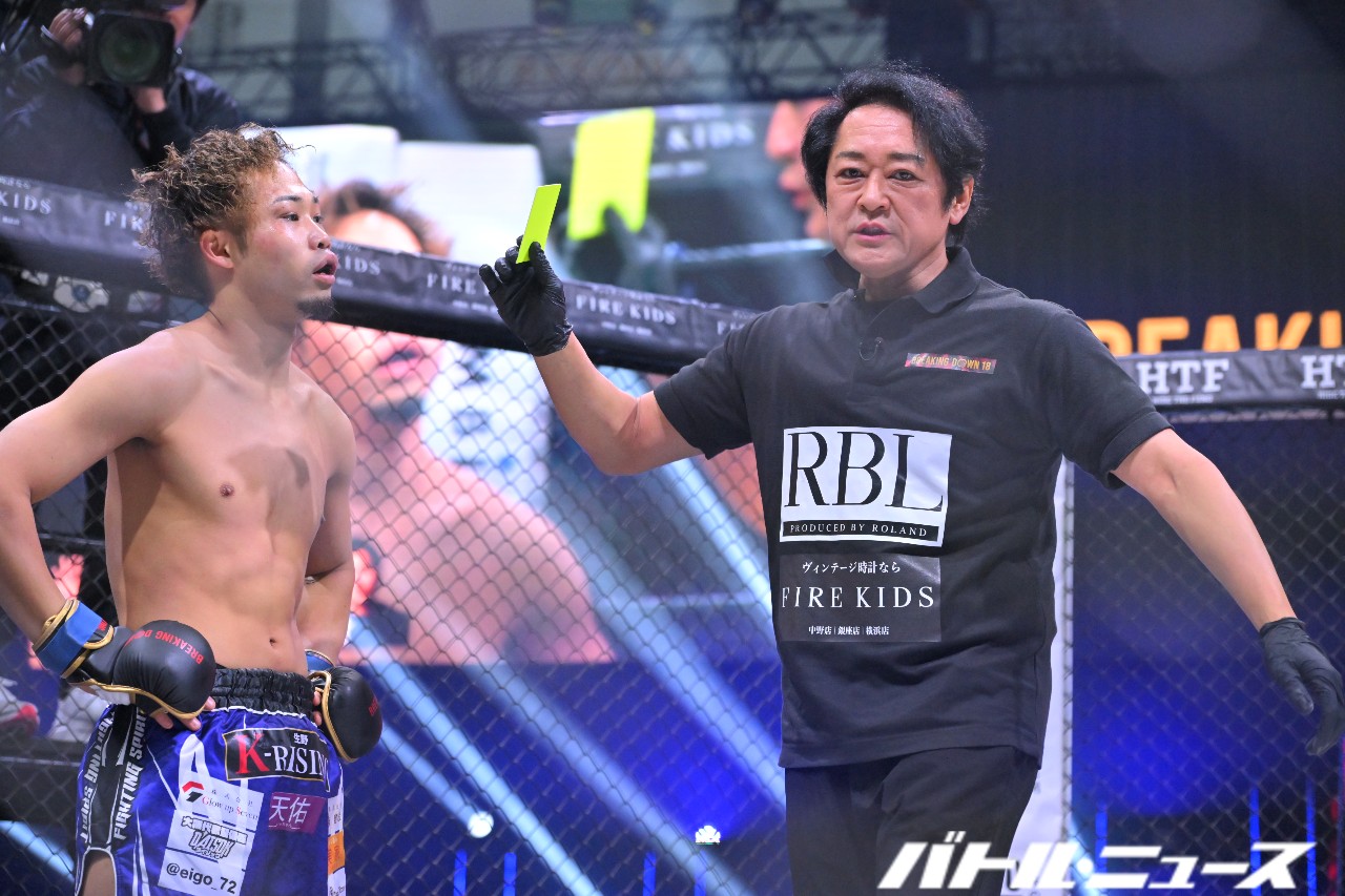 再開し、ボクがハイキックもレオがクリンチしてブレイク。ボクが左ハイから左フック。さらに右ミドルから左ストレート。さらに飛び蹴りも、避けたレオが殴りかかるが勢い余って前のめりに倒れてしまう。レオの後頭部をボクが踏みつけるがレフェリーが引き剥がしブレイク。これにはボクにイエローカードが出される。