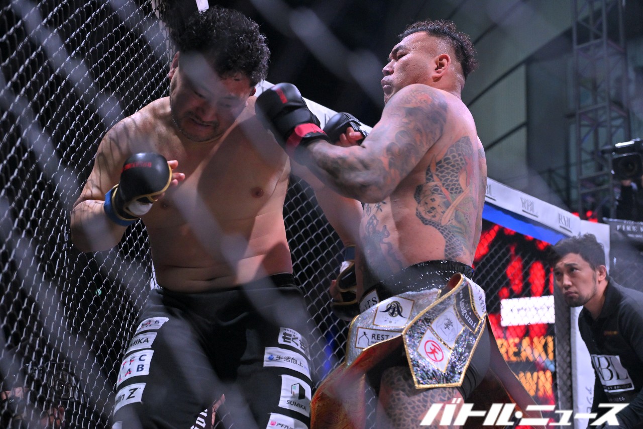 金野が飛び込んでフックも、那智が左右のフック連打。金野がケージに押し込んでブレイク。