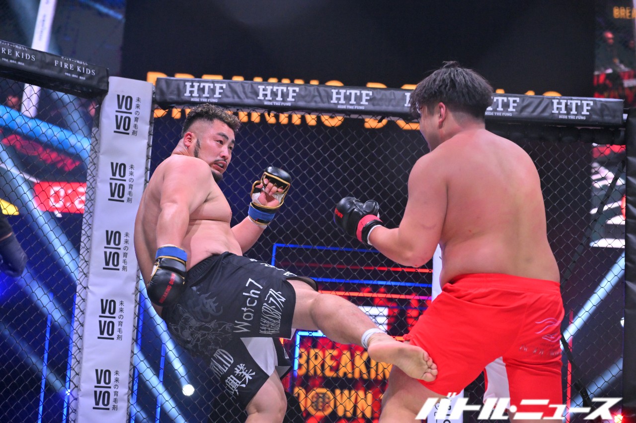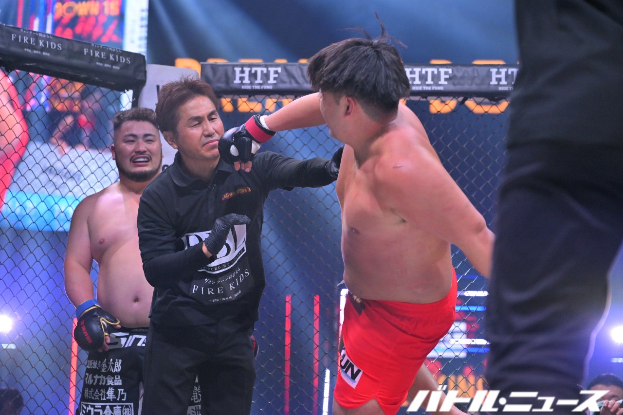 りゅう君がミドルも赤パンはかまわず左右のフック。さらにハイも空を切る。りゅう君が左右のミドルで動きを止め、ローからジャブで牽制。赤パンは前に出てパンチも空を切り、りゅう君は足をかけてコケさせる。
