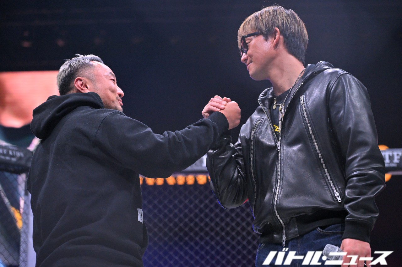 萩原「一颯の応援ありがとうございました。続いて僕も3月20日に名古屋で試合することになりました。(田中雄士がケージへ)今上がってきた相手なんですけど、関東最大のギャングのボスで、毎日ね、自分と戦い続けてきた人がね、どれだけの試合見せてくれるか楽しみなんで、みんな是非あの、名古屋の会場の方に応援来てくださいよろしくお願いします」