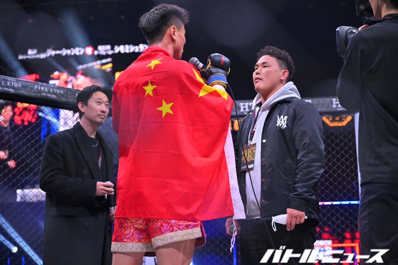 ジャー「私は中国からきたジャー・シャンミン。私のこと覚えといてください。まず感謝したいことが2つあります。1つ目は私のグループと私のコーチと仲間たちです。初めてブレイキングダウンに来ました。会場も広く沢山人も居てとてもいい大会だと思います。ただ相手が弱すぎます。CEO、一番強い人準備してくださいよ。ベルトも準備してください。さっきの相手、確か無敗でしたよね?ただ、私に負けました」