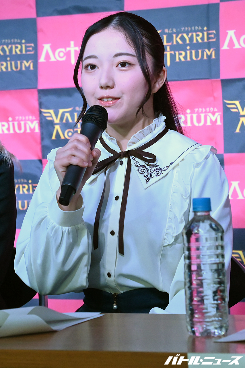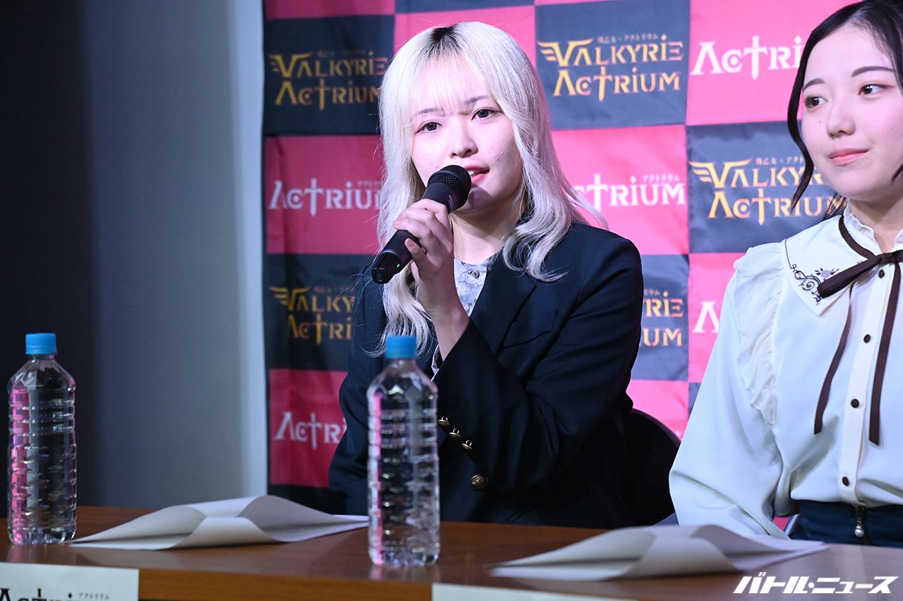 惡斗「今回、アクトリウムという団体で、まず最初に『VALKYRIE ACTRIUM-立花の章-(ヴァルキリーアクトリウム リッカノショウ)』というものをやっていきたいと思います。旗揚げ公演を皮切りにシリーズを展開していきたくて。今回の旗揚げって、あのヴァルキリーアクトリウムというものが、VRMMORPGゲームの世界を舞台にした、北欧神話をベースにした作品を作っていきたいなと思って、それで物語をやっていきたいんですけれども、今後の展開で月に1、2回やっていきたいという、まずはそのペースでやっていきまして、シーズンごとにストーリーを変えていって、あの各地、東京だけじゃなくて、大阪とか地方、各地、地方にも行きたいなと思っている次第であります。えっと、まずあの一作目、立花のショーの方では隣にいる初江律香ちゃんを主人公にして、デビューを含めてお披露目していきたいと思うんですけれども、私自身がアクトレスガールズ、女優×プロレスのアクトレスガールズという団体にも所属しておりまして、そちらのメンバーたちも交えて、アクトレスガールズの子たちと、ここにいる2人と西尾と、みんなであの上にあがっていきたいなって思っております。まだまだね、先のお話なんですけれども、ゆくゆくは夢としては、ソーシャルゲームとカードゲームにしたいとか、海外に行きたい、あとアニメ化したいと、本当にいろいろいっぱいあります。でもやっぱり夢は大きく持っていきたいなって思いまして、将来的に女の子たちにこうなりたい、このキャラクターになりたいっていう憧れる職業になっていきたいなと思って。上を目指して行きたいと思います。よろしくお願いいたします」