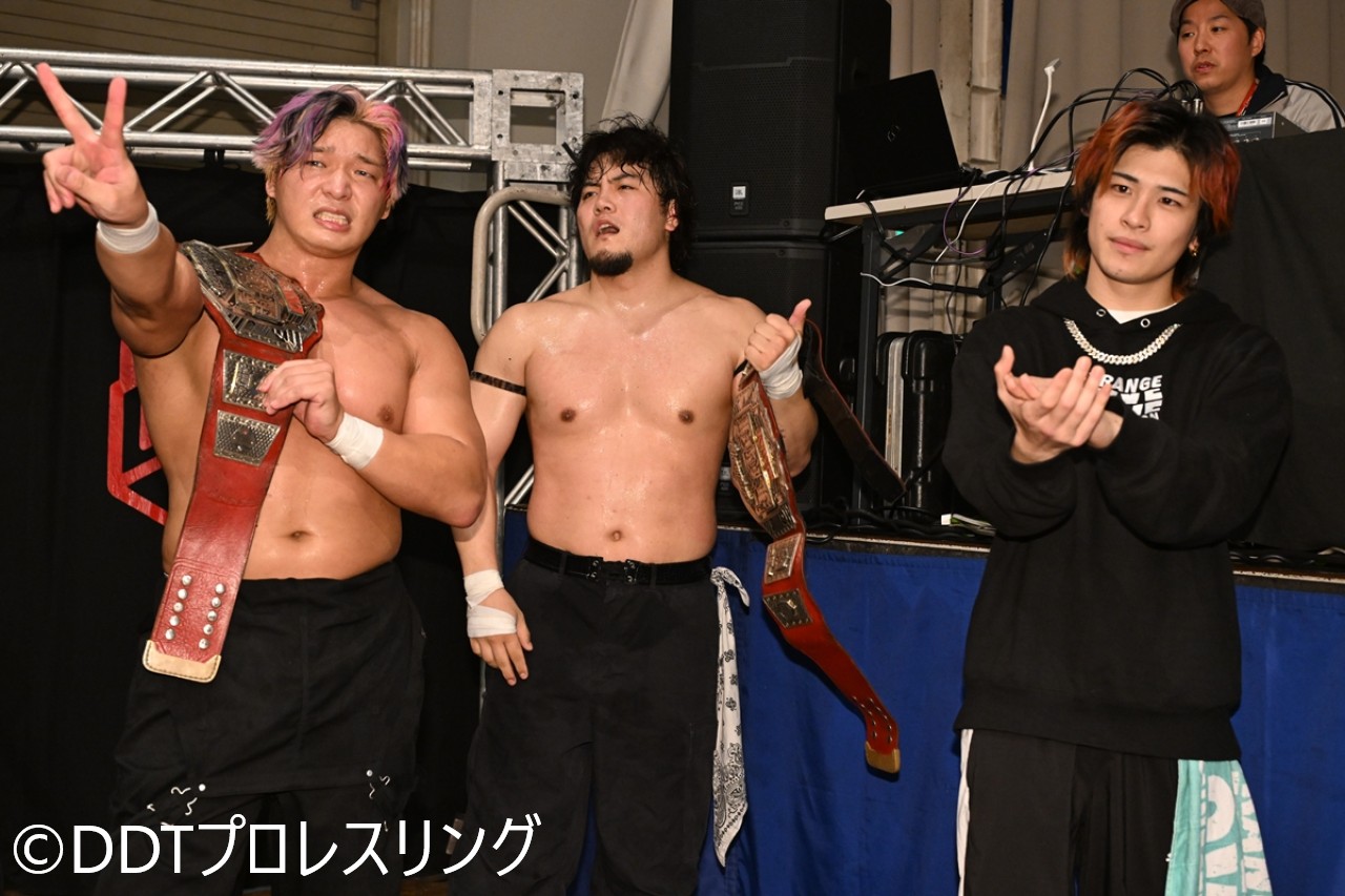 DDTプロレスが12月19日、東京・後楽園ホールで『RING FINALE 2025 ~全員主役のカーテンコール~』を開催した。KO-Dタッグ王者組のMAO、KANONのストレンジ・ラブ・コネクション(S.L.C.)がF-SWAGの政岡純&ガイア・ホックスを破り、2度目の防衛に成功。2026年1・25後楽園で前王者のThe Apex(飯野雄貴&納谷幸男)がベルト奪回に挑むことが決まった。