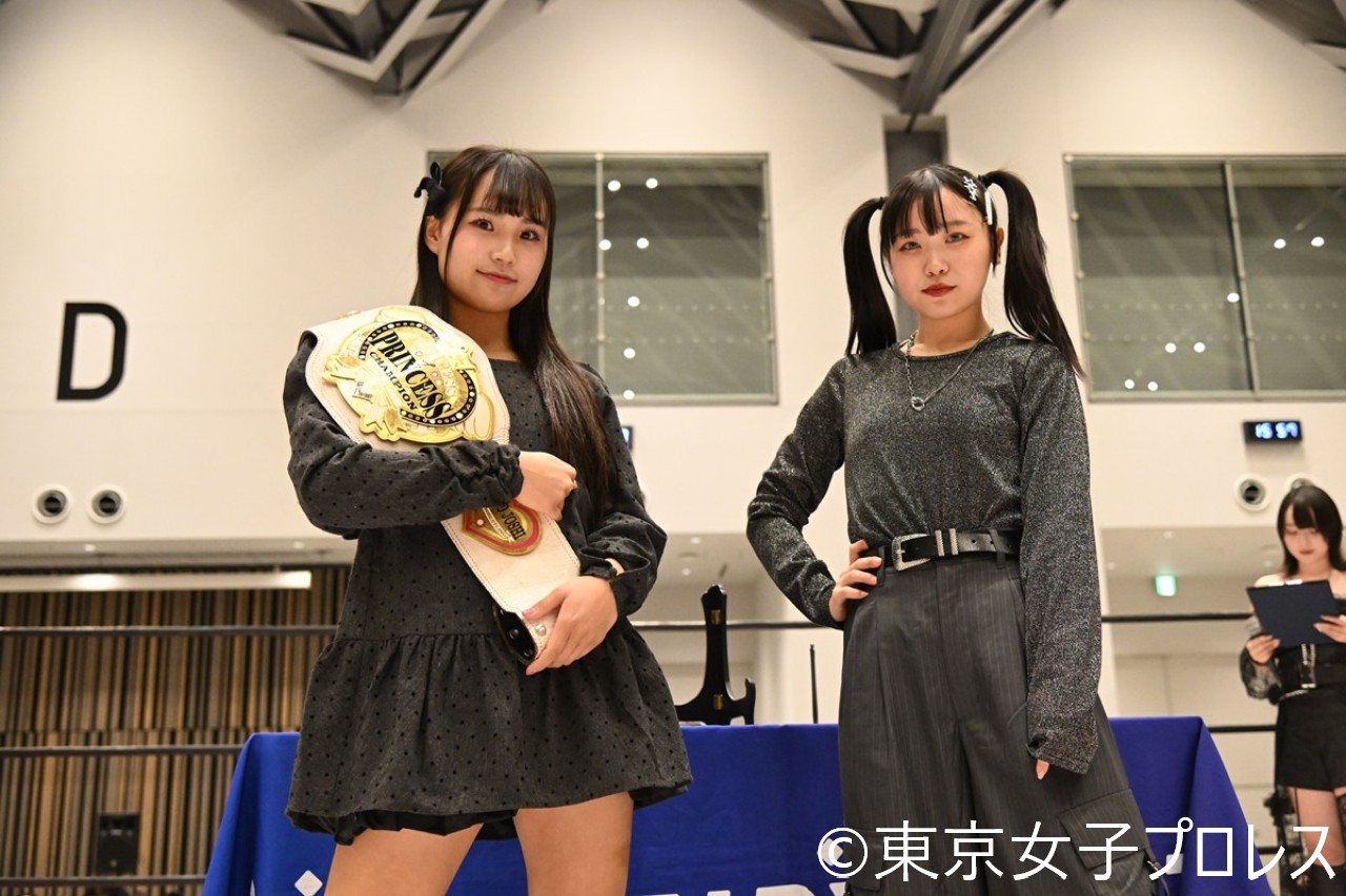 東京女子プロレスが12月21日、東京・東京たま未来メッセで『せ~の、メリークリスマス!2025』を開催した。大会開始前、2026年イッテンヨン(1月4日)後楽園ホールで行われるプリンセス・オブ・プリンセス選手権試合(王者=渡辺未詩vs挑戦者=鈴芽)の公開調印式及び記者会見が実施され、渡辺が王座死守を宣言した。