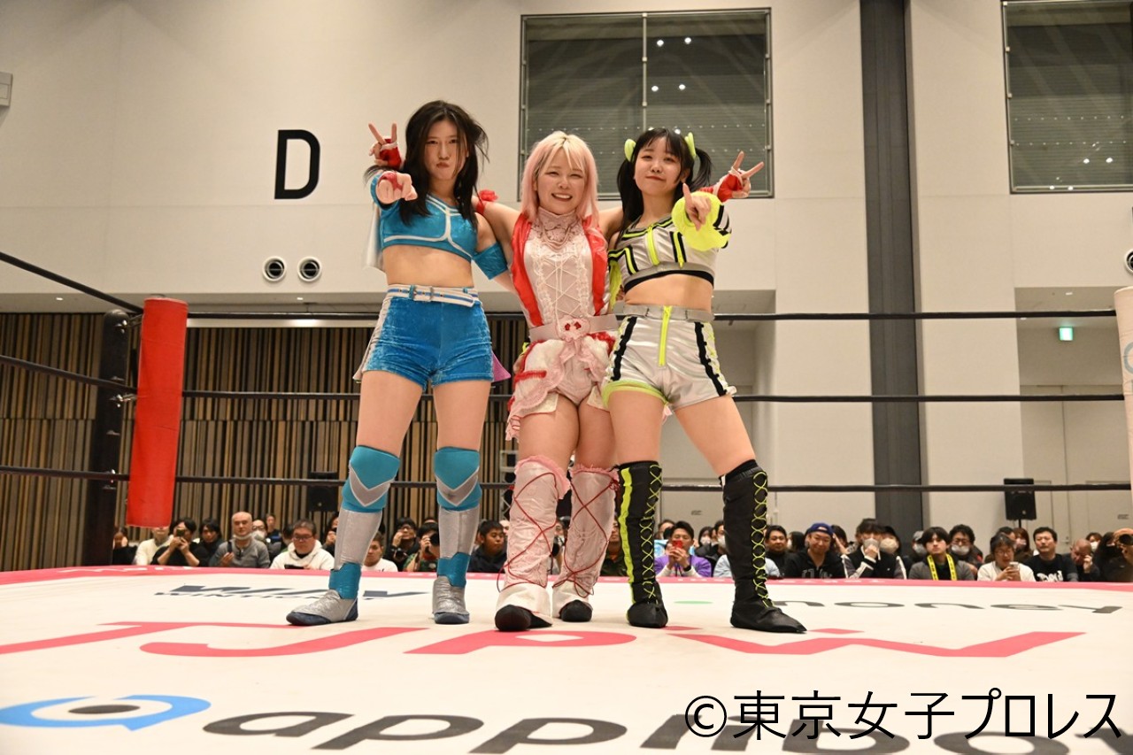 試合後、愛野は「挑戦者組、勝ったぞ! 私と鈴芽は前哨戦はもうないけど、でもあと1試合(12・27新宿)あるんだよ。あと1試合戦うってことは、私たちはまた強くなるってことだからら。イッテンヨンに向けてたくさんパワーを溜めていこう!」と勝利の雄たけび。