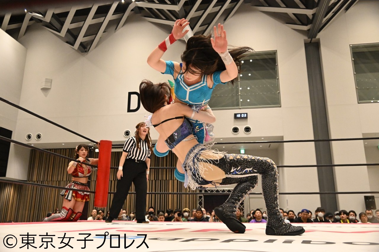東京女子プロレスが12月21日、東京・東京たま未来メッセで『せ~の、メリークリスマス!2025』を開催した。来年イッテンヨン(1月4日)後楽園ホールでのプリンセス・オブ・プリンセス選手権試合(王者=渡辺未詩vs挑戦者=鈴芽)、プリンセスタッグ選手権試合(王者組=上福ゆき&上原わかな《Ober Eats》vs挑戦者組=愛野ユキ&風城ハル《春雷烈火!!プリズムグリード》)のダブル前哨戦が行われ、愛野が上福から直接勝利を挙げ、ベルト獲りに弾みをけた。