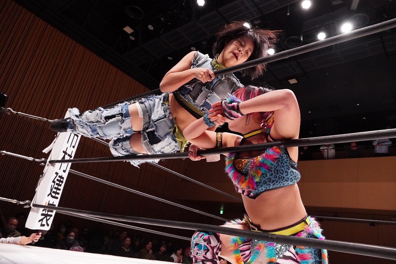 LLPW-Xの年内最終戦は定期開催中の神田明神大会。第1試合では中学2年生・14歳の藤原あむ(練習生・彩夢、改め)が、マーベラスの桃野美桜を相手にデビュー戦に臨んだ。開始早々から執拗なヘッドロックで絞め上げる桃野は、前後からドロップキックを撃ち込むとキャメルクラッチへ。続いてロープに振られる藤原だが、ドロップキックとエルボーの連打で反撃を開始。ボディスラムで投げ切ると再びドロップキックを連打して、逆さ押さえ込みでフォール。さらにはロープ際の桃野に619を繰り出して会場を驚かせる。桃野のダイビング・ボディープレスを受けてもカウント2でキックアウトしてみせるが、最後は厳しい角度の逆エビ固めにギブアップ。小学4年生から続けてきた空手の技を封印しプロレス技のみでの初陣ながら、上々のスタートを切った。