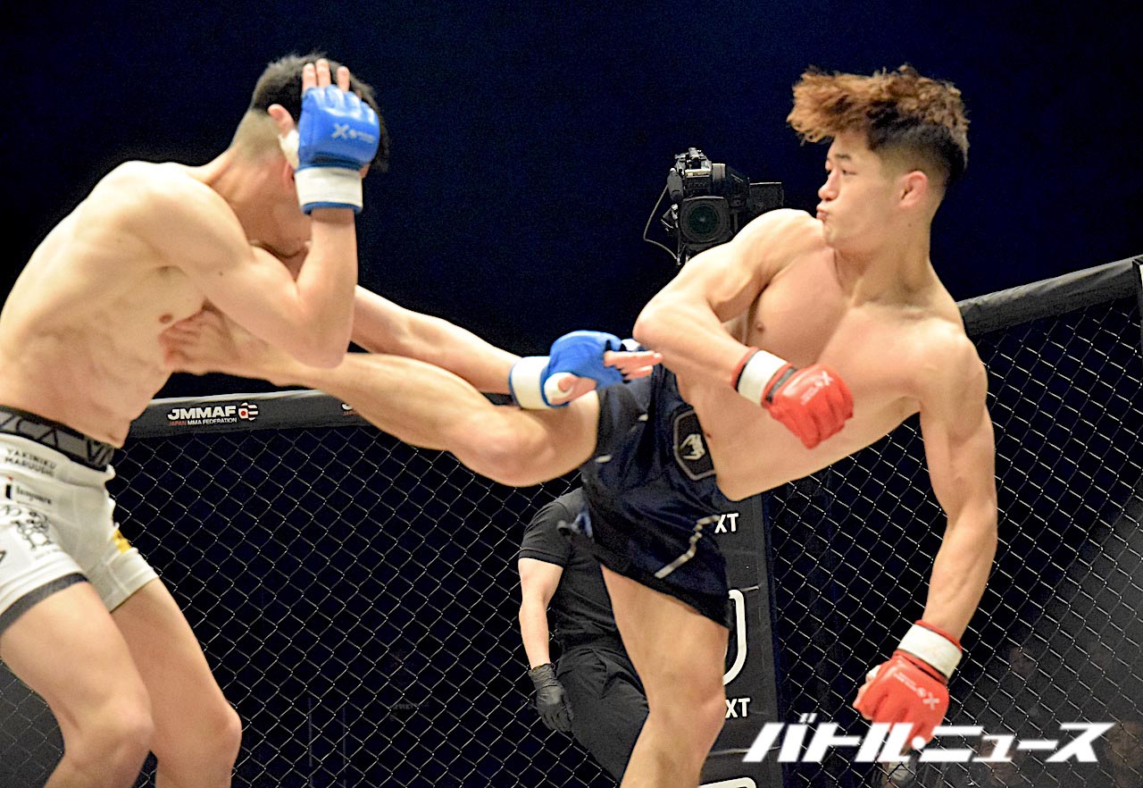 1R。田嶋がステップしながらロー、パンチ、またローと動く。井村は左ミドルを入れて距離を詰める。ケージを背負った田嶋に組みつきケージへ押し込む。ヒジで抵抗する田嶋。井村は両足をかかえて寝かせようとするが、田嶋は立ってワンツーを入れ離れた。