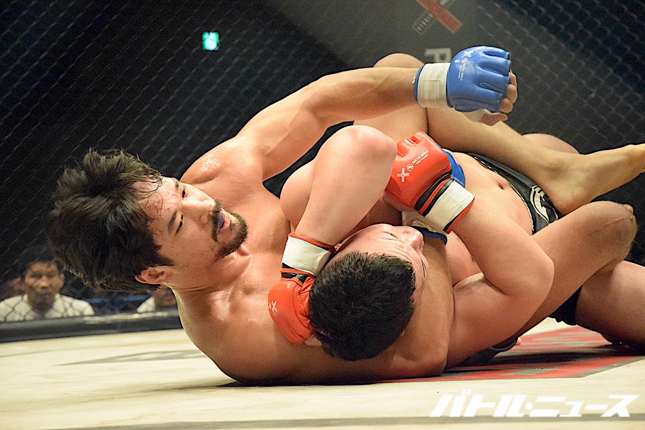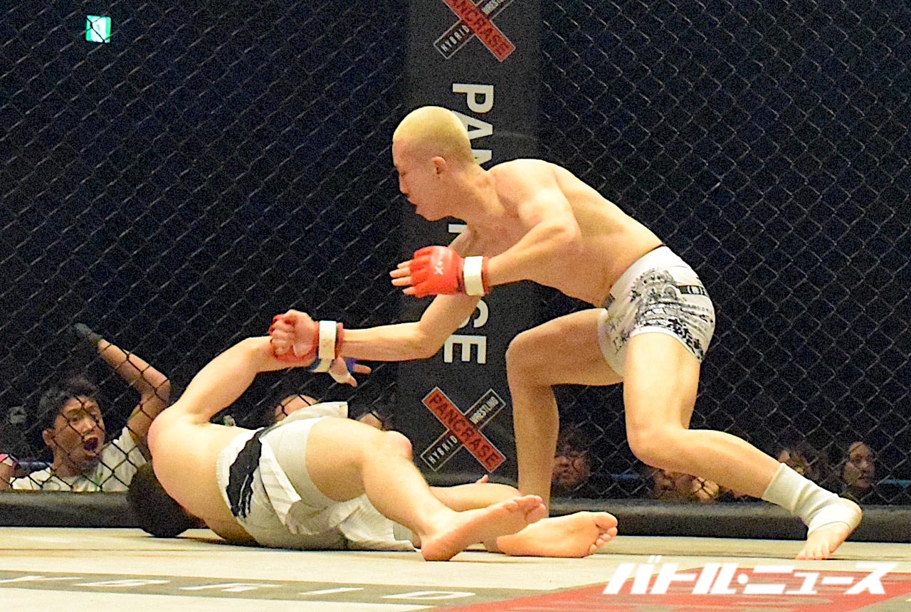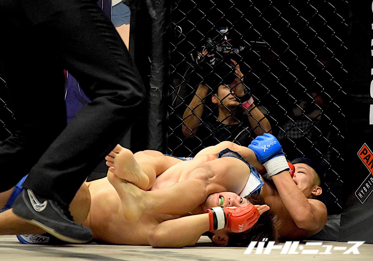 菅がボディ連打、ヒジも打ち込む。さらにパウンドを打ったところで終了。