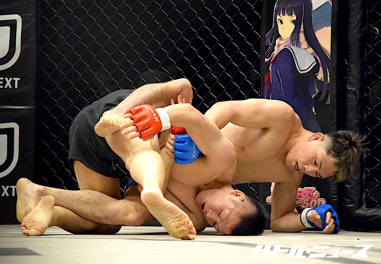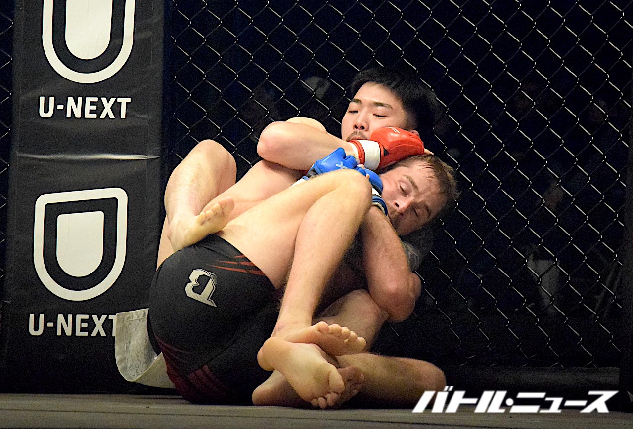 プレッシャーをかける小澤。齋藤は蹴り。小澤が組んだが齋藤はすぐ離れる。齋藤がローから組み、後ろへ投げバックマウントへ。小澤はヒジ。
